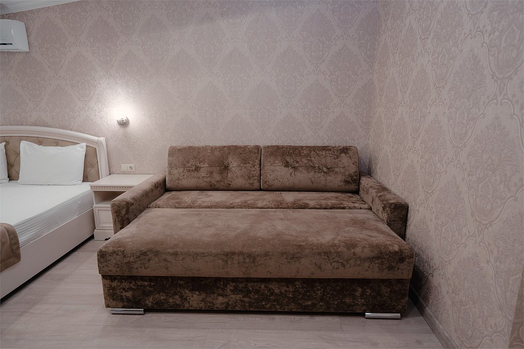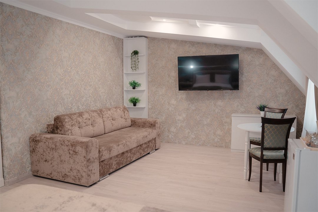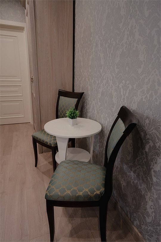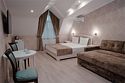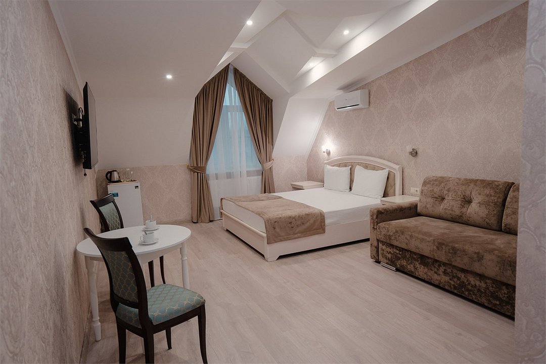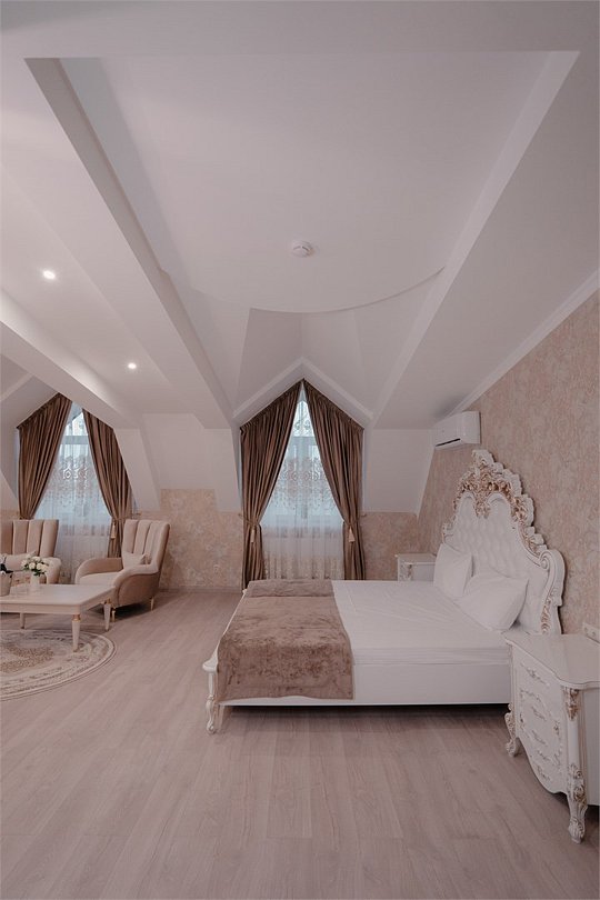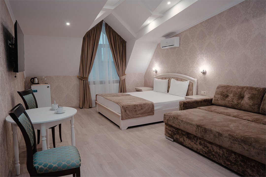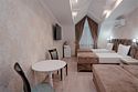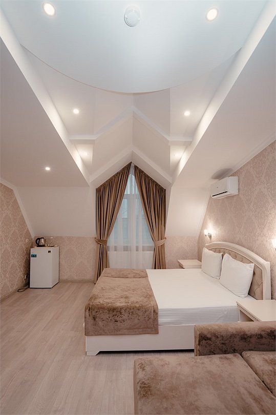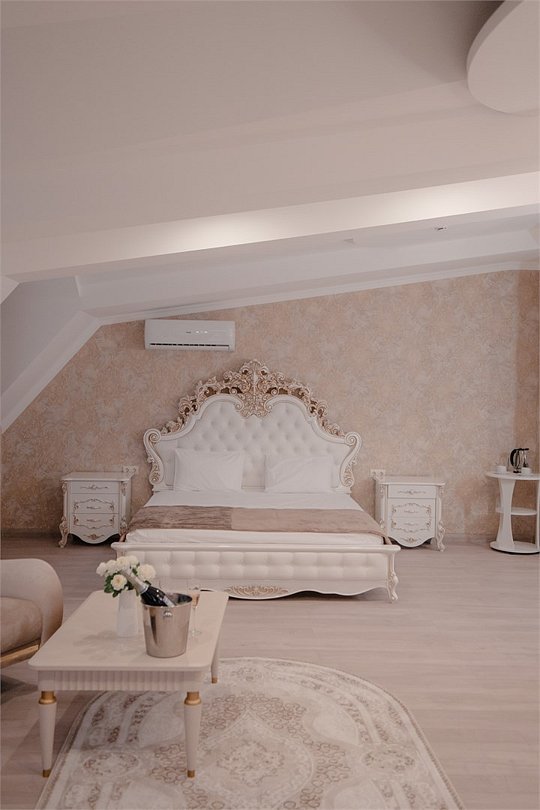 "Бизнес" однокомнатный номер повышенной комфортности. В Вашем распоряжении просторная, уютная спальня с большой удобной кроватью. Интерьер выполнен в выдержанном классическом стиле с нежными приглушенными тонами в оформлении всех зон.Услуги и удобства
