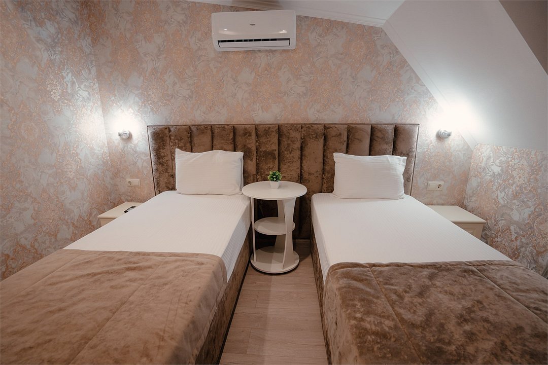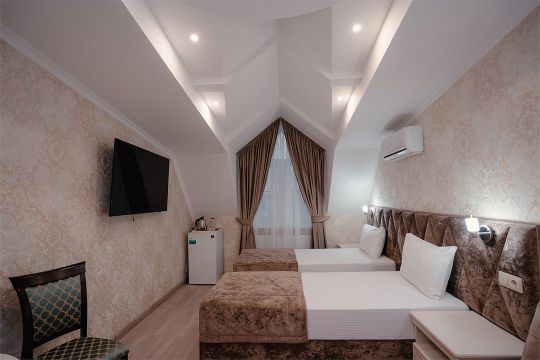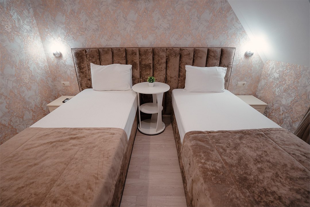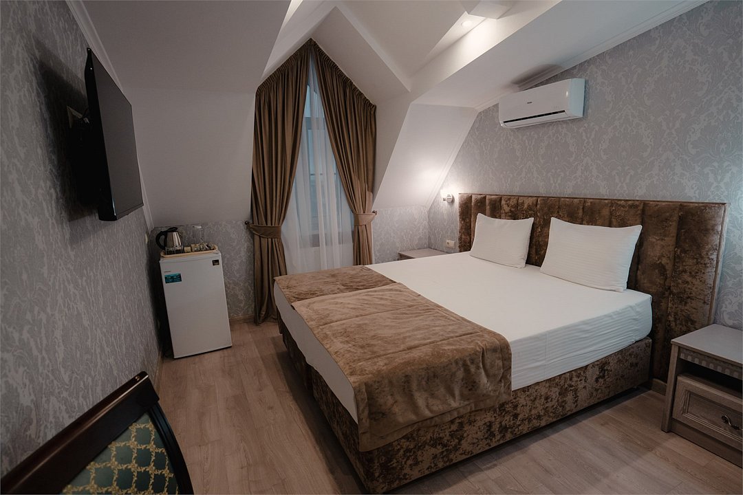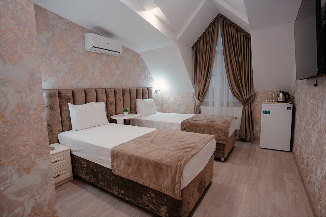 Удобные классические однокомнатные номера категории «Стандарт» с двумя односпальными или одной двуспальной кроватью, оснащены всем необходимым для совмещения комфортного отдыха с работой.Услуги и удобства
