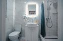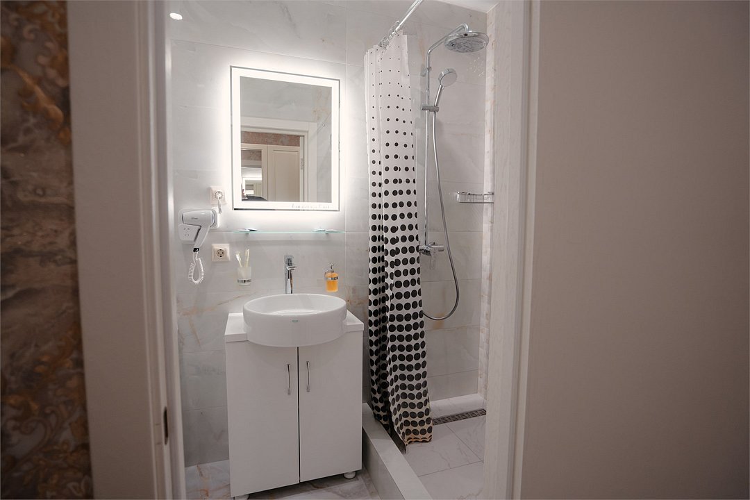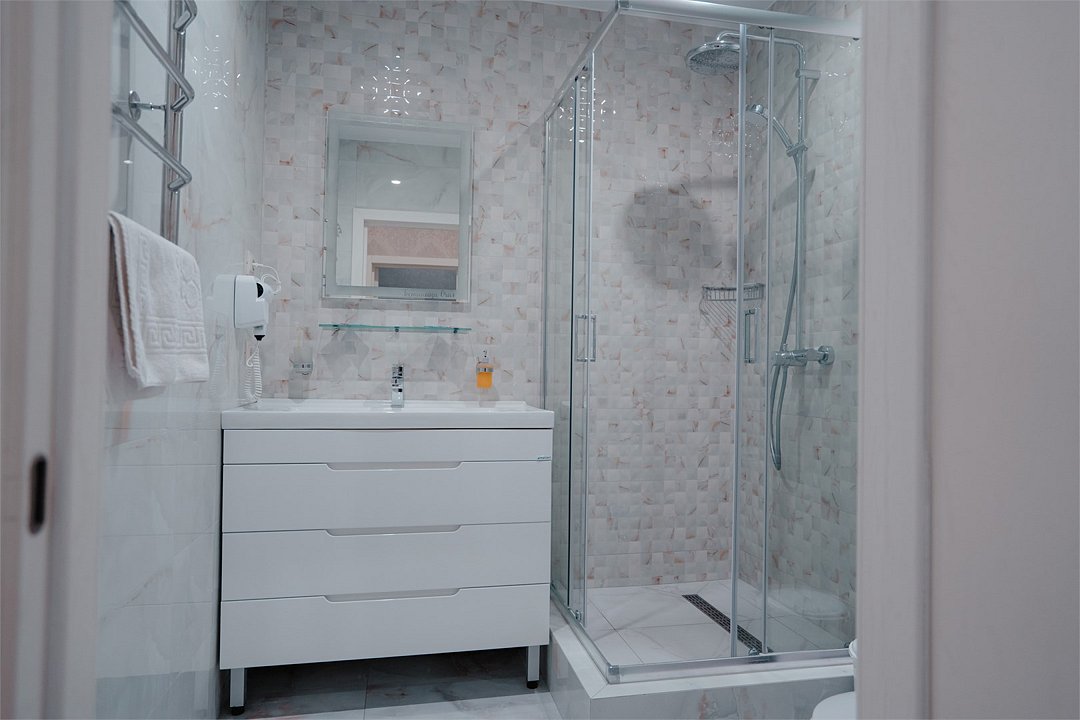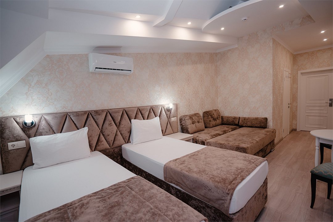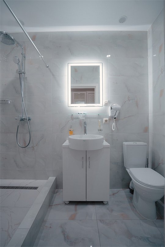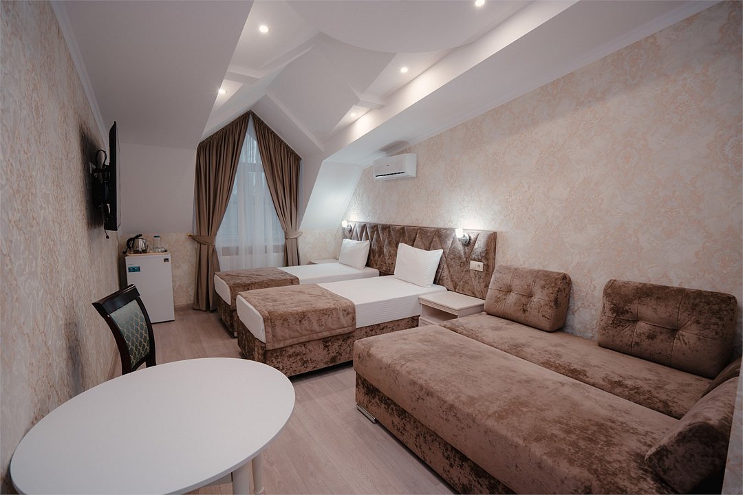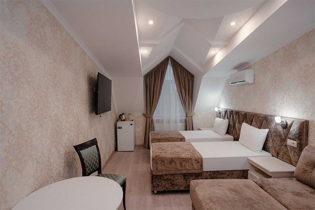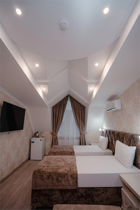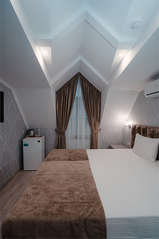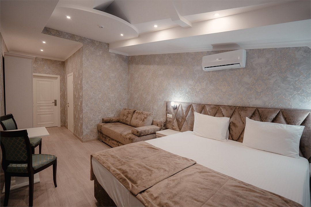 телевизор, спутниковое телевидение, кабельное телевидение, Wi-Fi, интернет, холодильник, фен, утюг, ванна или душевая кабина, халаты, банные полотенца, тапочки, косметические средства, двуспальная кровать, две односпальные или большая двуспальная кровать, гладильная доска, стулья, шкаф для одежды, вешалки, зеркало, чайный набор, обслуживание номеров, чайник, унитаз, раковина, отопление, душ, вид на город, ламинат, стаканы, стул, тумба, туалетные средства, сплит-система, цифровое тв, москитная сетка, шкаф-купе, гостиничная парфюмерия, телевизор со Smart TV, уборка номера, вешалки-плечикиВ номере
