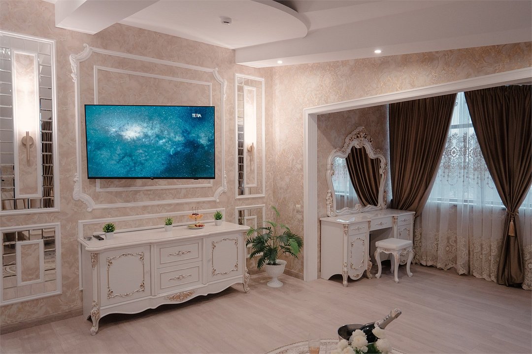 телевизор, спутниковое телевидение, кабельное телевидение, Wi-Fi, интернет, холодильник, фен, ванна или душевая кабина, санузел, халаты, банные полотенца, тапочки, косметические средства, двуспальная кровать, гипоаллергенное белье, гладильная доска, шкаф для одежды, вешалки, чайный набор, обслуживание номеров, чайник, унитаз, отопление, душ, вид на город, ламинат, стаканы, стул, тумба, сплит-система, цифровое тв, москитная сетка, гостиничная парфюмерия, телевизор со Smart TV, уборка номера, вешалки-плечикиВ номере