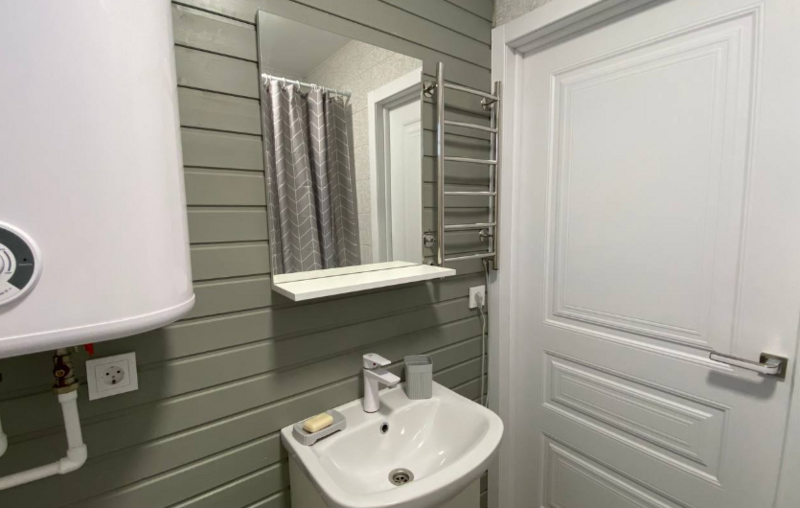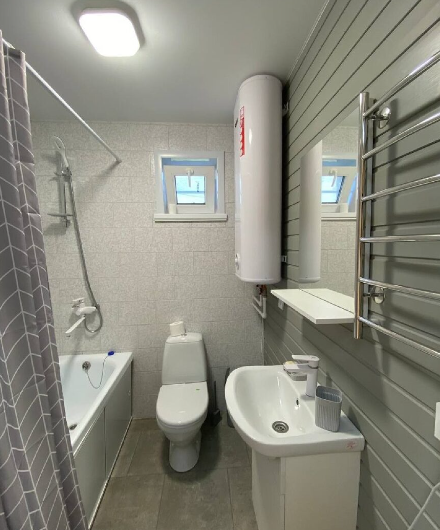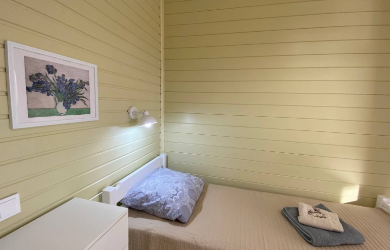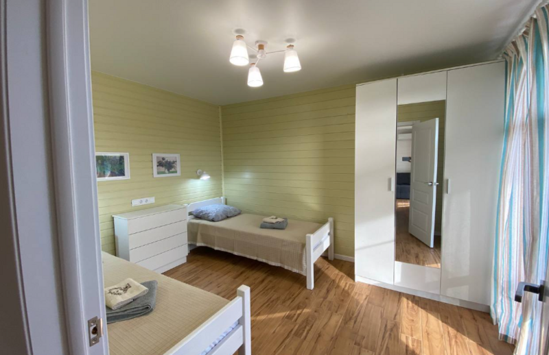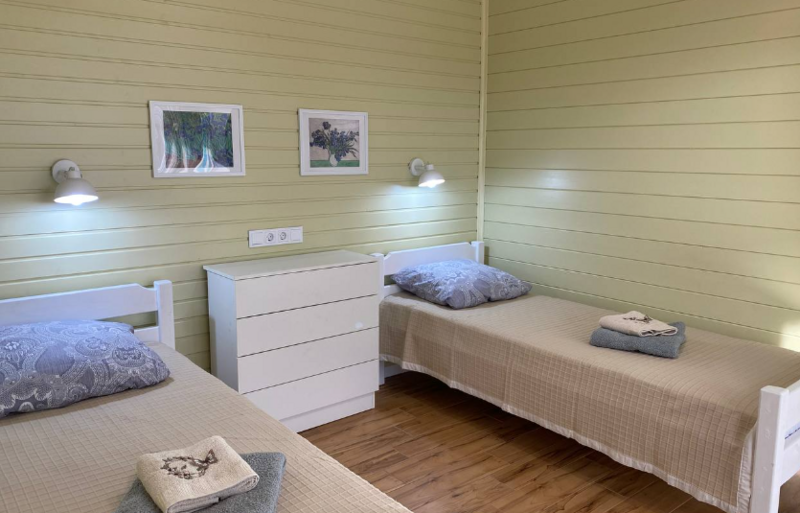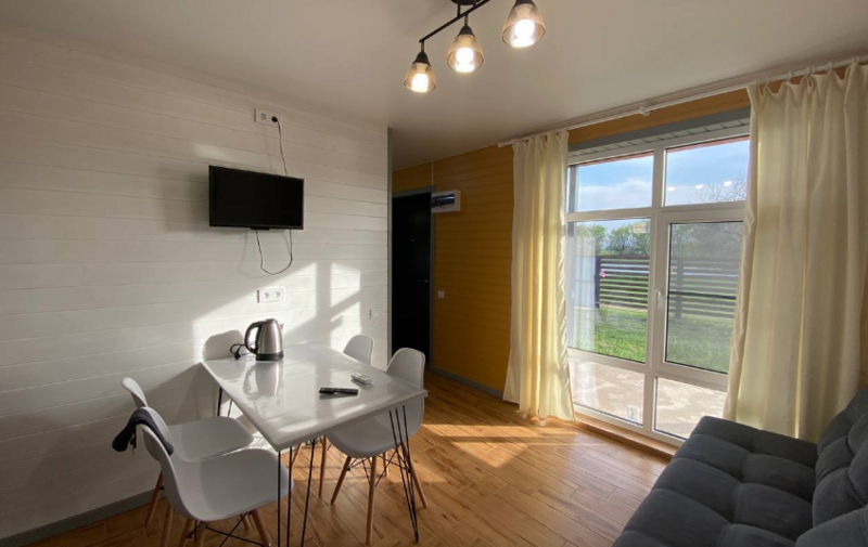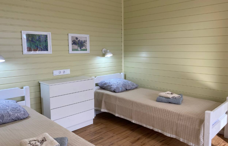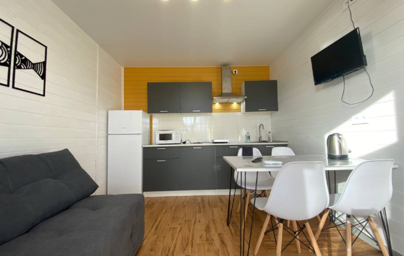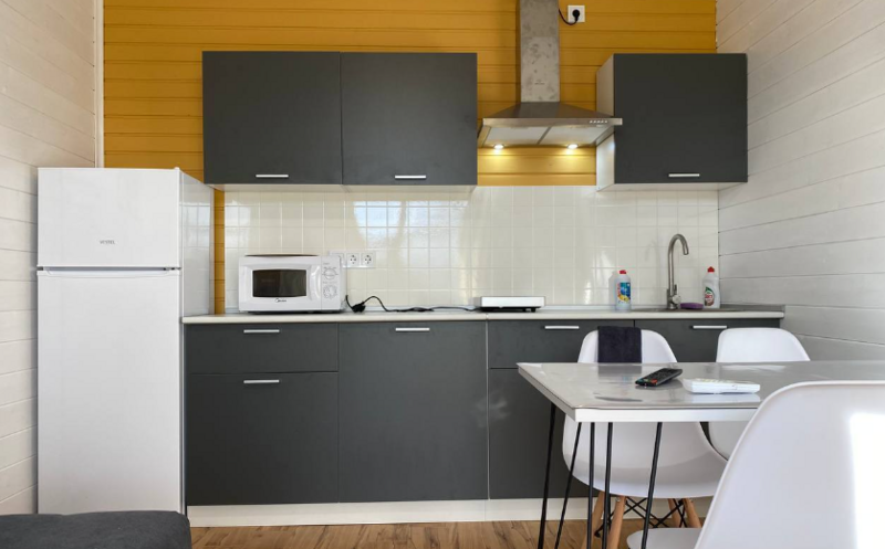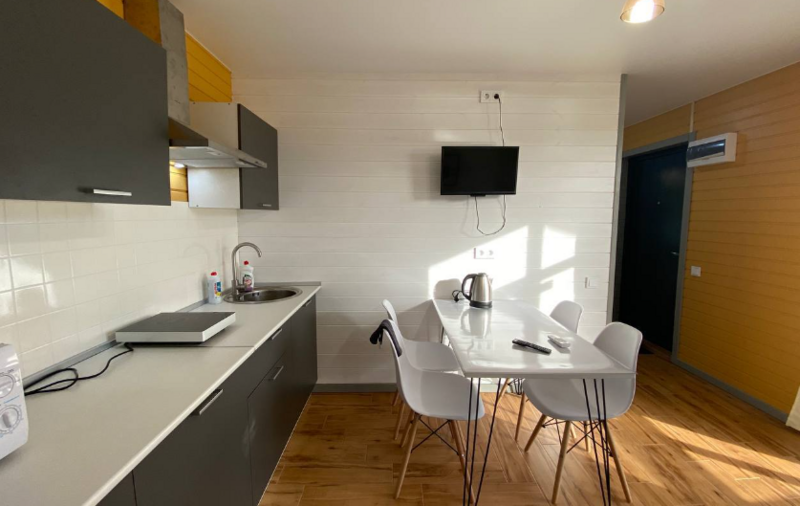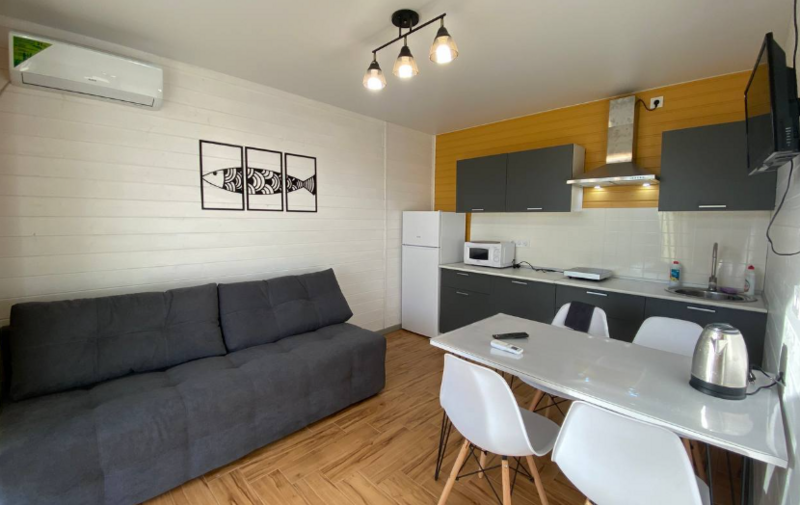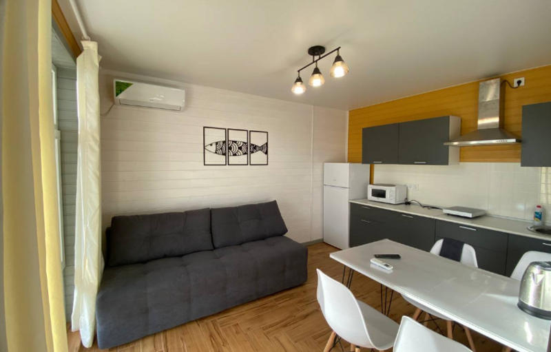 Кухни-гостиные оснащены так, чтоб в них была возможна полноценная готовка и отдых: холодильник, микроволновка, безимпульсная индукционная плитка, мощная вытяжка, набор посуды из 2х кастрюль, большой сковороды и всех необходимых столовых приборов, там же расположен большой диван для отдыха, стол и стулья, телевизор и кондиционер. Санузел с ванной (актуально в прохладное время года) и бойлером на 100 литров; спальня — 2 односпальных кровати из массива дерева, специальные орто-матрасы, выдерживающие нагрузку до 140 кг, новое хлопковое постельное, подушки из натурального гусиного пуха (сон будет сладким), по 2 полотенца на каждого гостя.