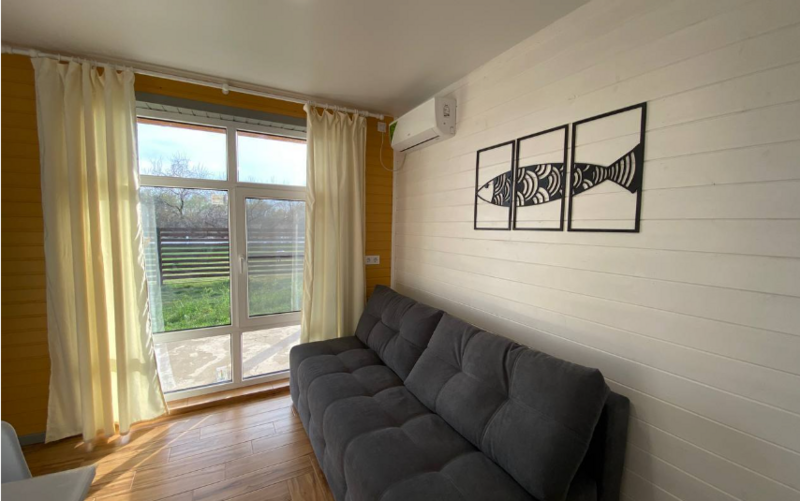 На кухне-гостиной предоставлены все удобства для полноценного отдыха и приготовления пищи: холодильник, микроволновка, индукционная плита без импульсных излучений, мощная вытяжка, набор кухонной посуды, умывальник, телевизор и кондиционер. Ванная комната с ванной (особенно актуальна в прохладное время года) и бойлер на 100 литров; спальня с двумя односпальными деревянными кроватями, ортопедическими матрасами, новым хлопковым постельным бельем, подушками из гусиного пуха и по 2 полотенца на гостя.