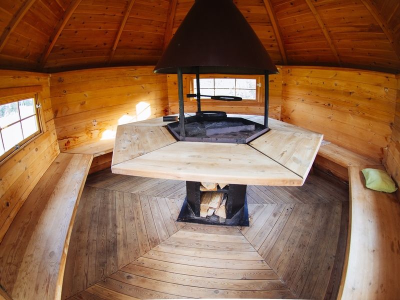 Внутри гриль-домиков находятся столы с посадочными местами и встроенным грилем, который служит источником обогрева и местом для готовки. Также отдельно предоставляется дополнительный мангал, уголь, дрова и розжиг.