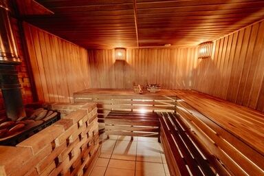 Внутри обеих бань находятся зоны для парения, туалет и душ, место для отдыха, чистые полотенца, 19 литров воды, телевизор, чайник, микроволновка, холодильник, стол, чистая посуда.