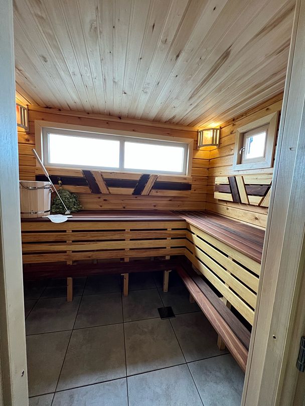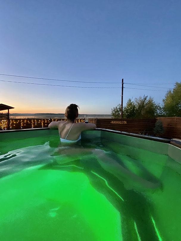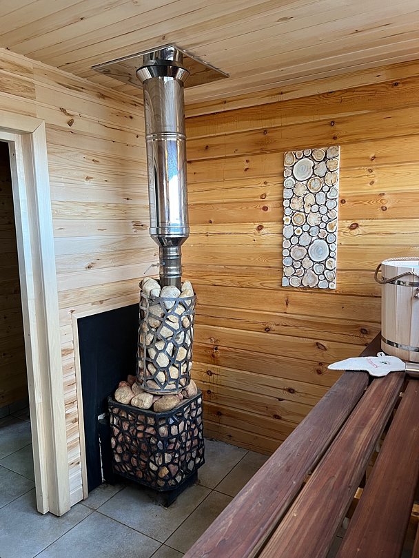 Для полного расслабления предусмотрен теплый чан под открытым небом, откуда можно любоваться звездами, а также жаркая банька.