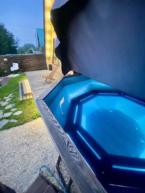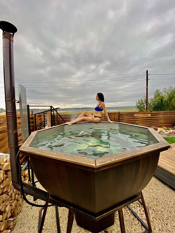 Банный чан, изготовленный из нержавеющей пищевой стали марки AISI 304. Изнутри чан обшит сибирской лиственницой. Вместимость до 8 человек.