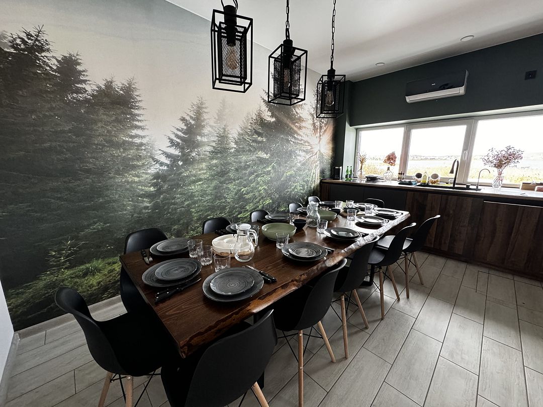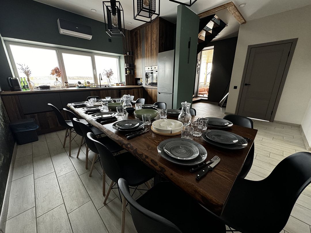 - столовая-гостиная с большом столом на 12 человек;