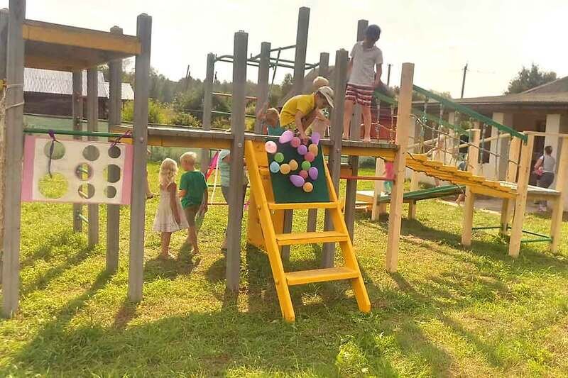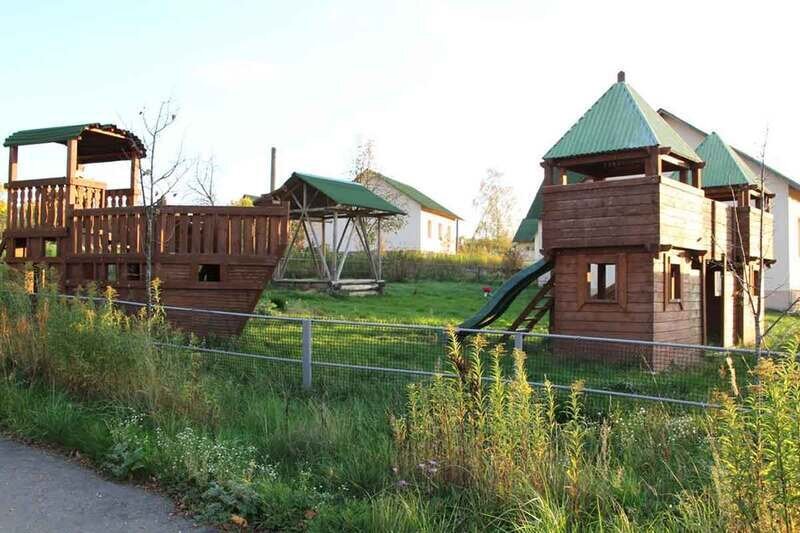 Дети могут весело проводить время в игровом городке, на площадке с качелями и батутами или наблюдая за жизнью питомцев фермы.
