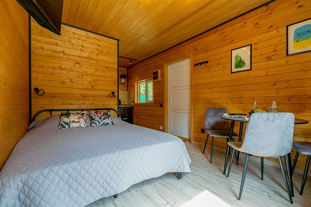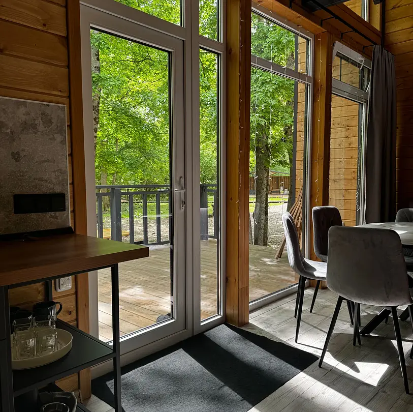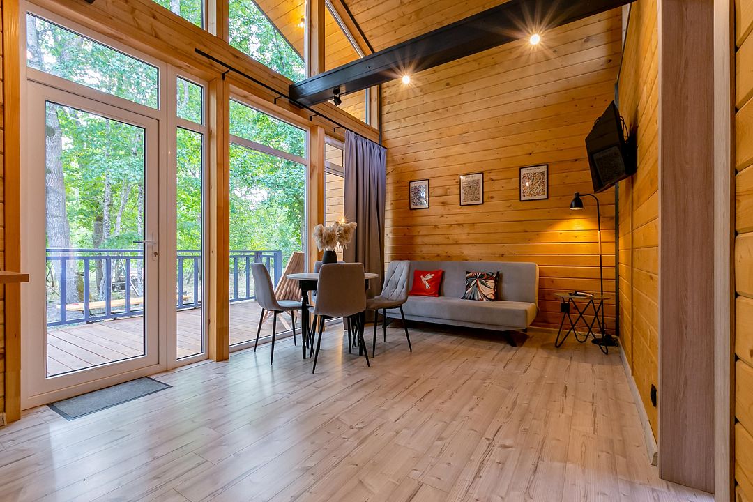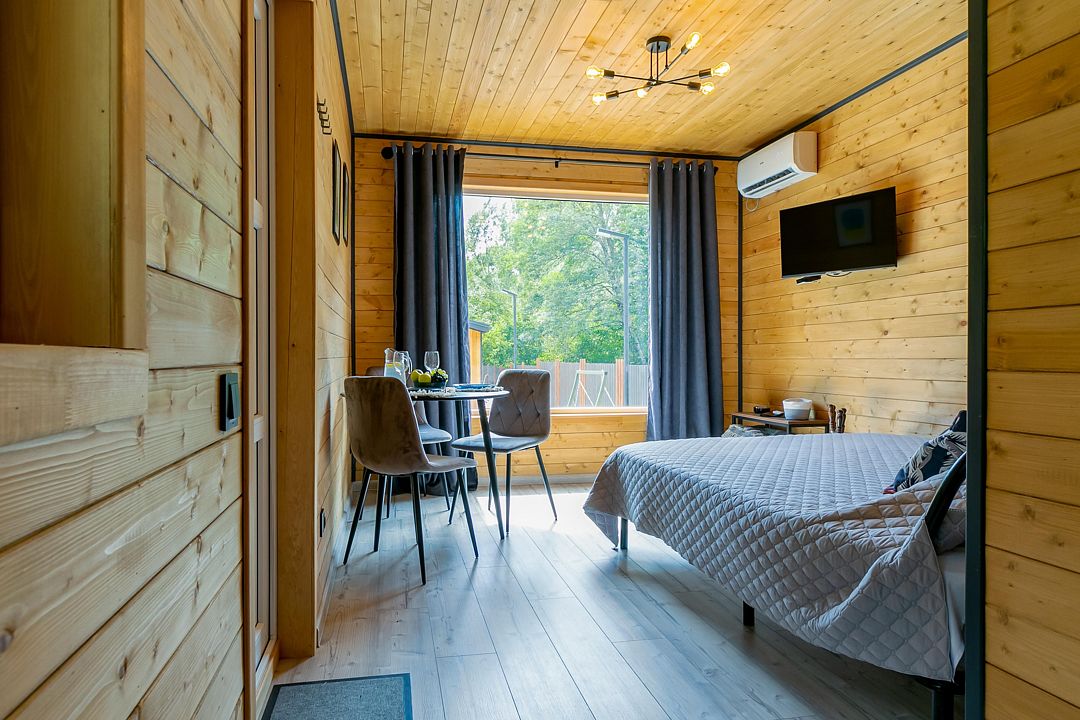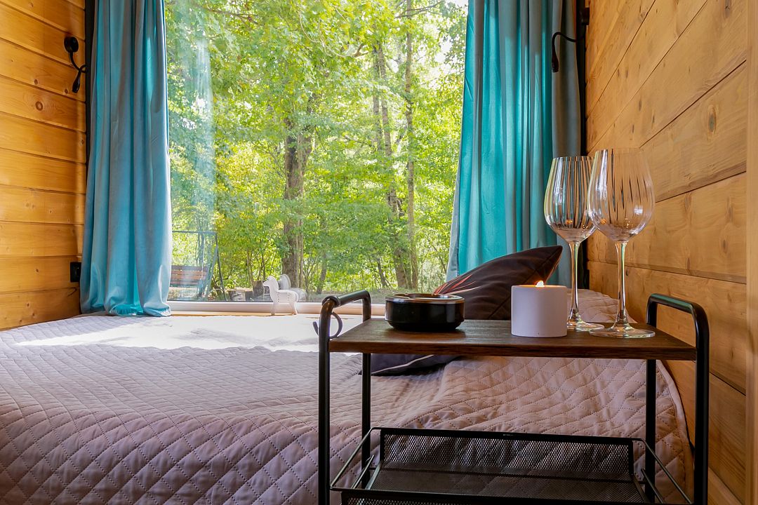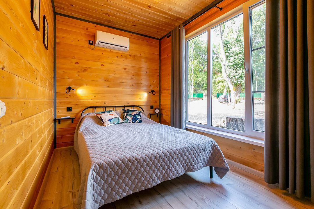 Экологичные домики из натуральных материалов органично вписаны в ландшафт, создавая ощущение полной гармонии с окружающим лесом и горной рекой. Внутри — продуманный до мелочей интерьер со всем необходимым для комфортного проживания.