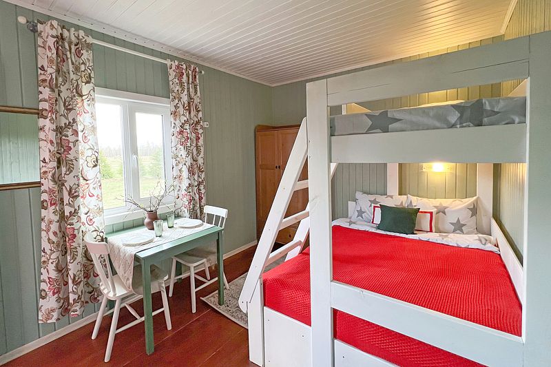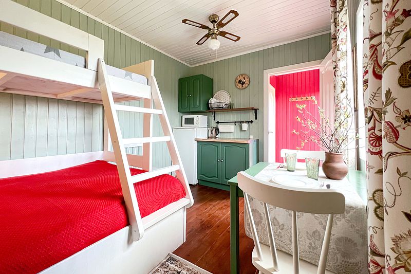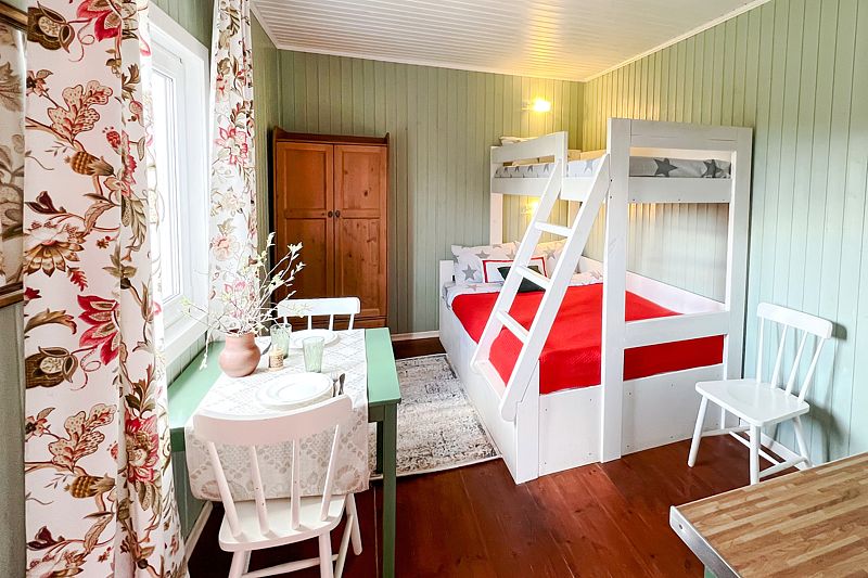 В доме: деревянная двухъярусная кровать (снизу двуспальная, сверху односпальная), прикроватные светильники, шкаф, зеркало, потолочный вентилятор, обеденный стол, стулья и табуреты, небольшая кухня, укомплектованная микроволновой печью, мультиваркой, холодильником, чайником, мойкой, необходимой посудой и столовыми приборами.