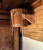 Бак с горячей водой вкупе со студеной артезианской позволяют регулировать температуру воды в шайках, которая придется по душе самому взыскательному ценителю бани. Для любителей облиться после парилки предусмотрен подвесной бочонок – 20 литров обжигающего холода.