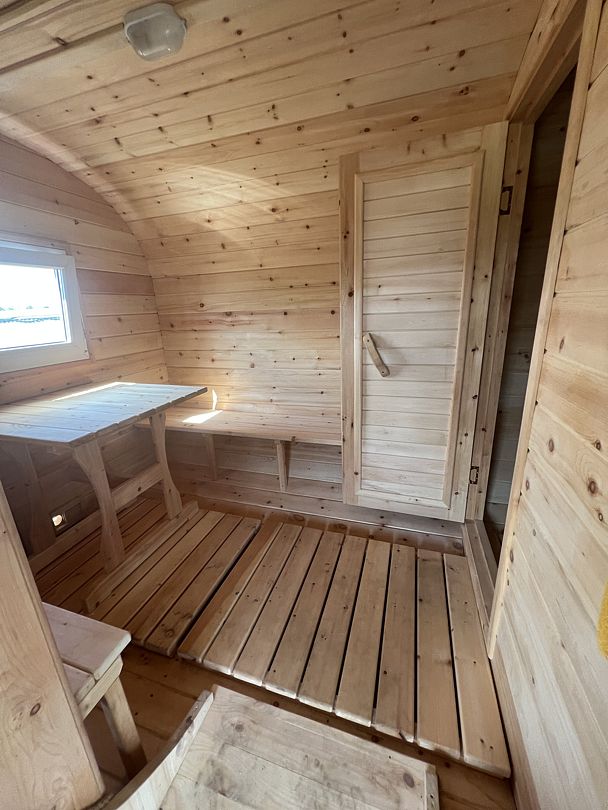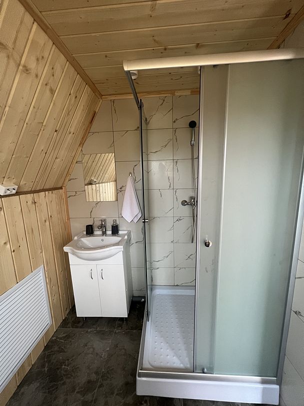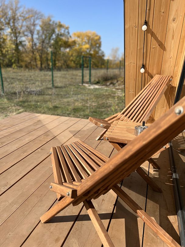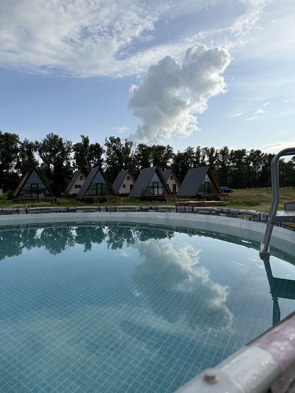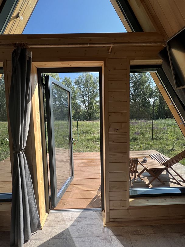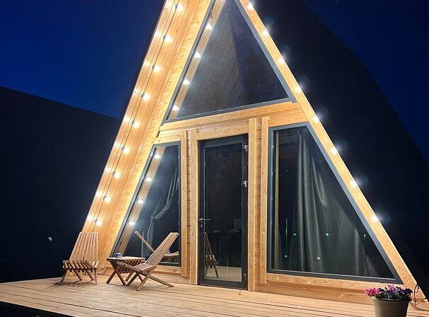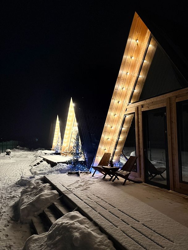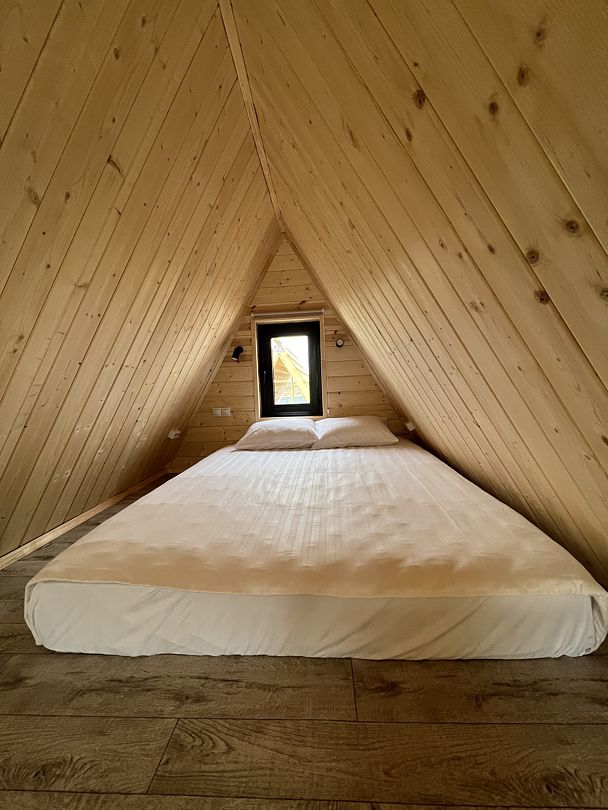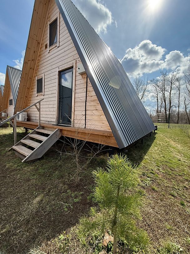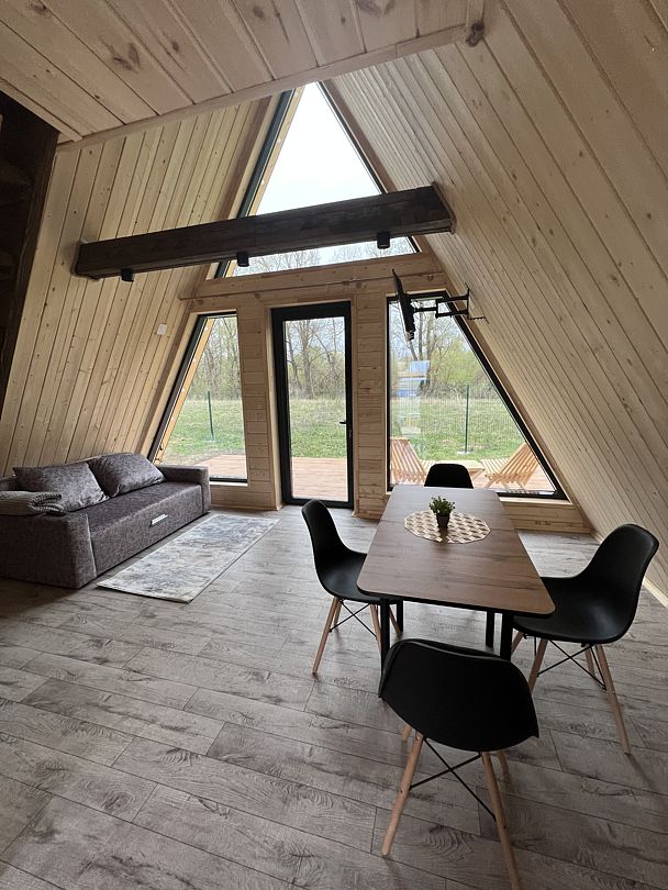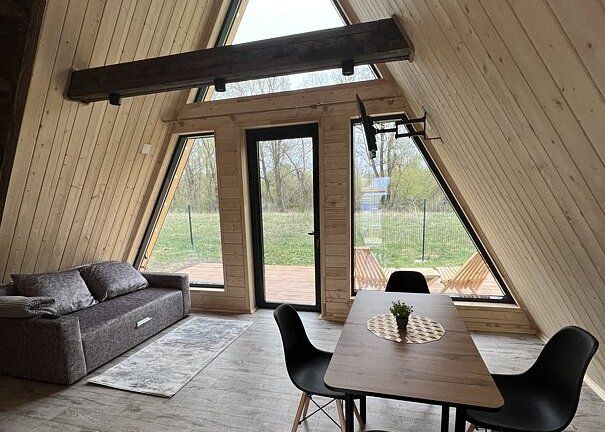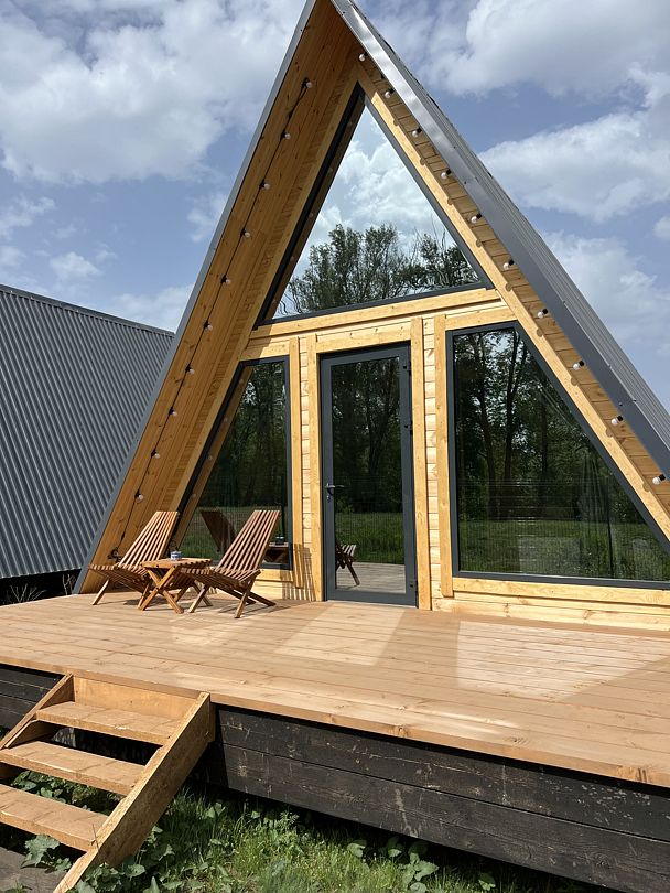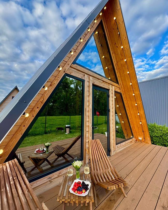 На ухоженной территории глэмпинга для размещения гостей подготовлены уютные 4-х местные домики A-frame с видом на лес и реку, оборудованные всем необходимым для комфортного проживания. В каждом домике имеется кухня, холодильник, СВЧ-печь, чайник, электрическая плита, вся необходимая посуда и постельные принадлежности. Для создания интерьеров были использованы только экологичные материалы. Возле каждого домика установлен мангал.