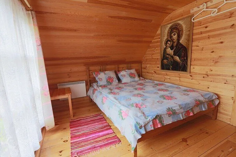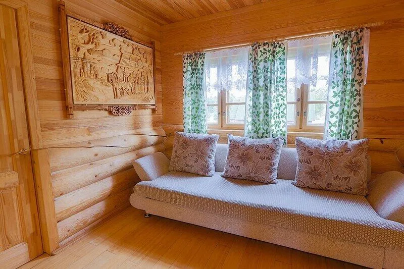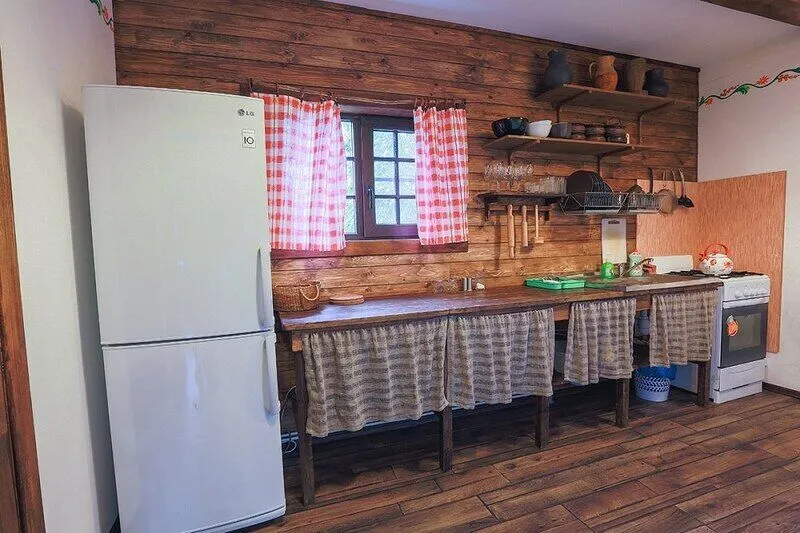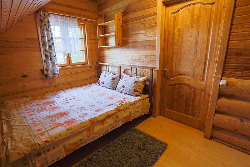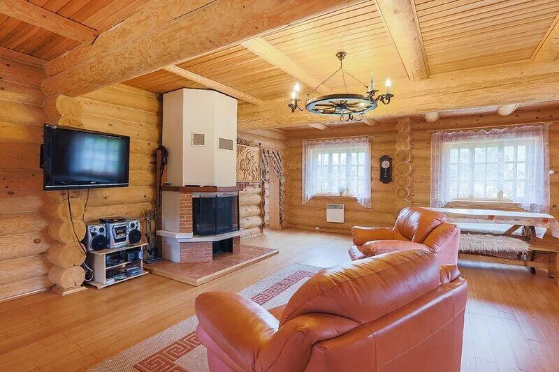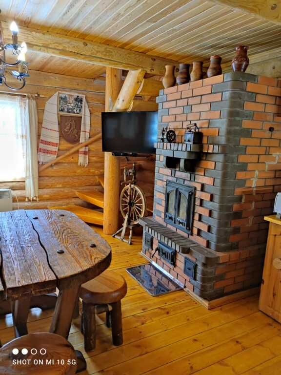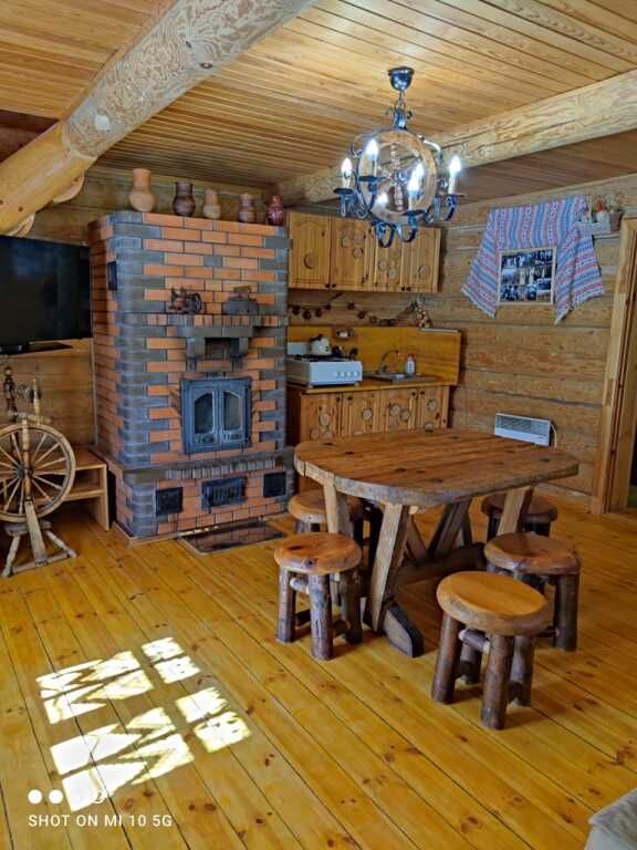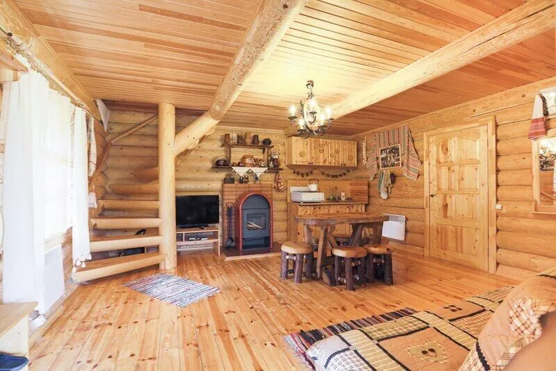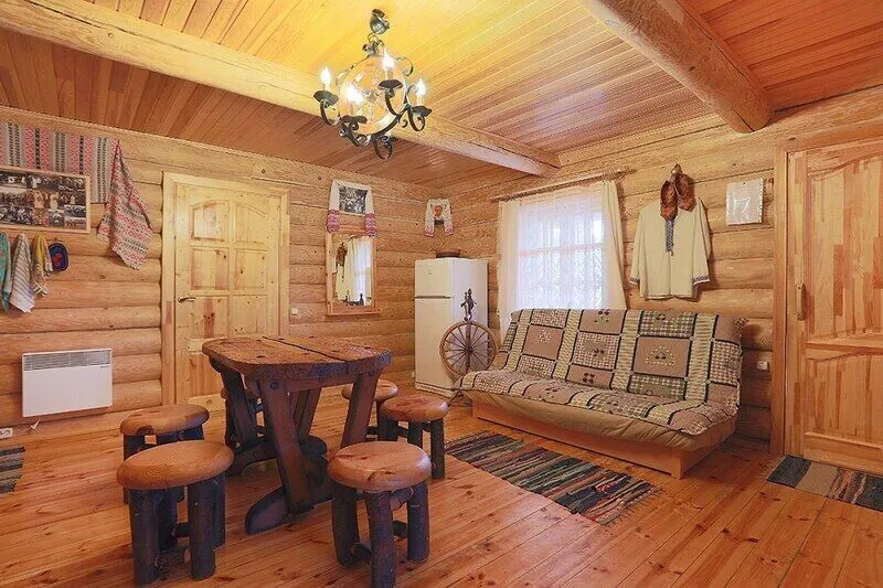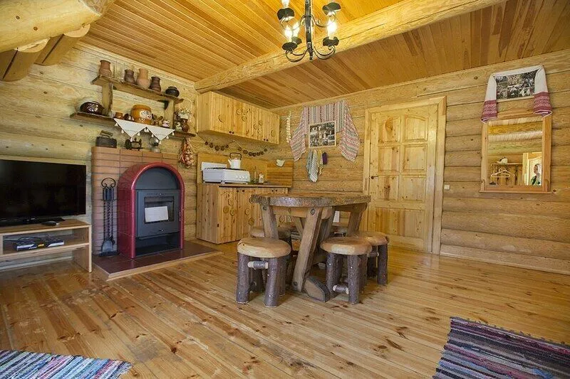 - камин-печь, кровать в виде бочки, деревянный стол с лавками, кухня полностью оборудованная, раздельные туалет и душ.