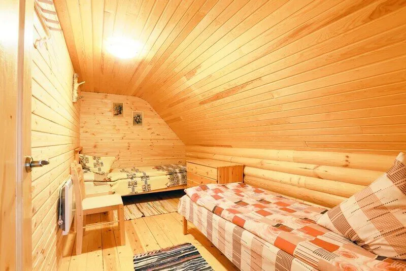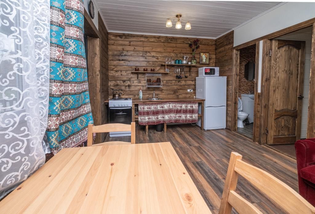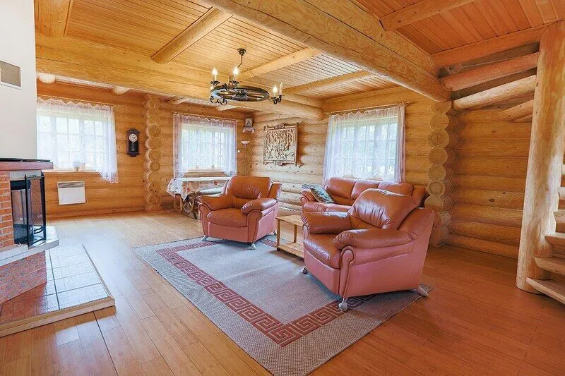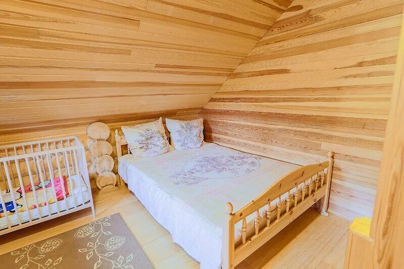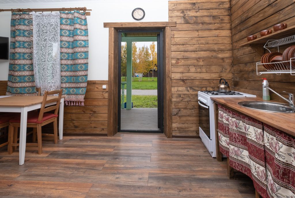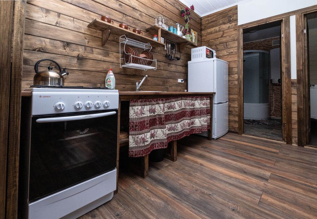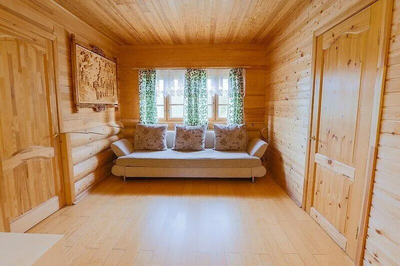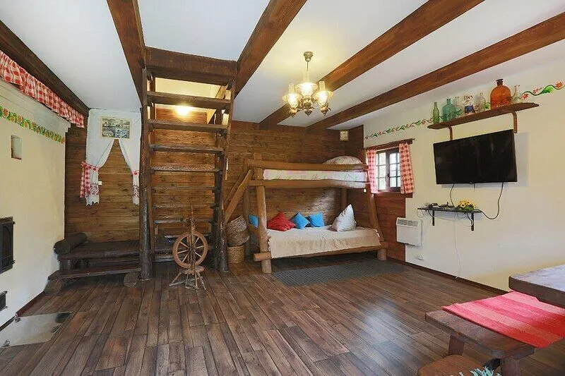 - камин-печь, кровать в виде бочки, деревянный стол с лавками, кухня полностью оборудованная, раздельные туалет и душ.