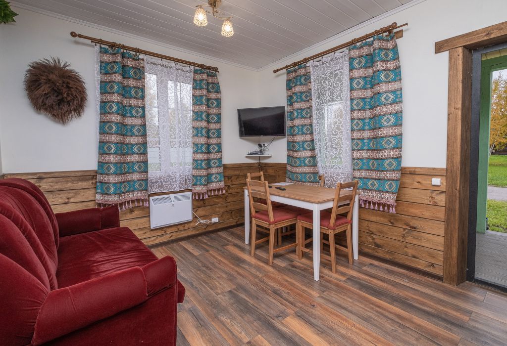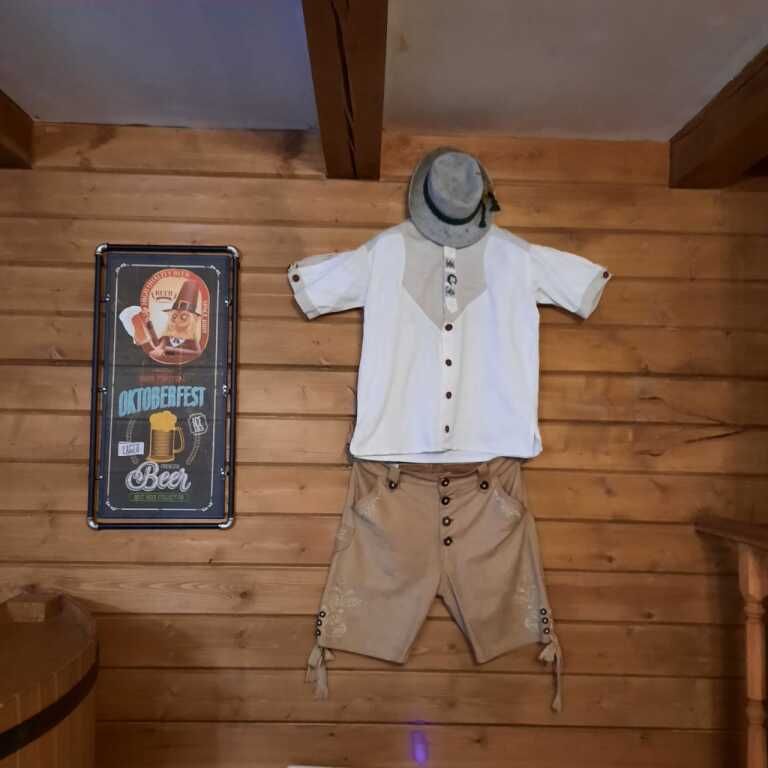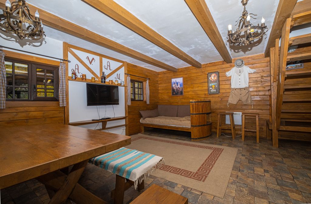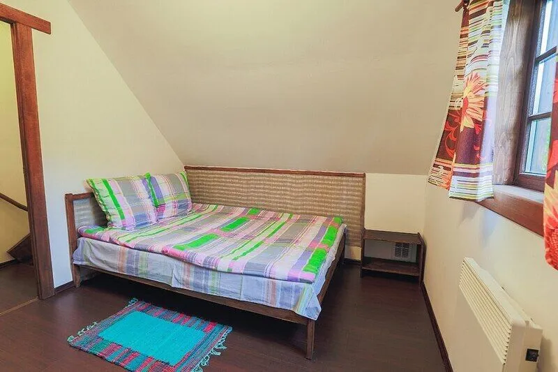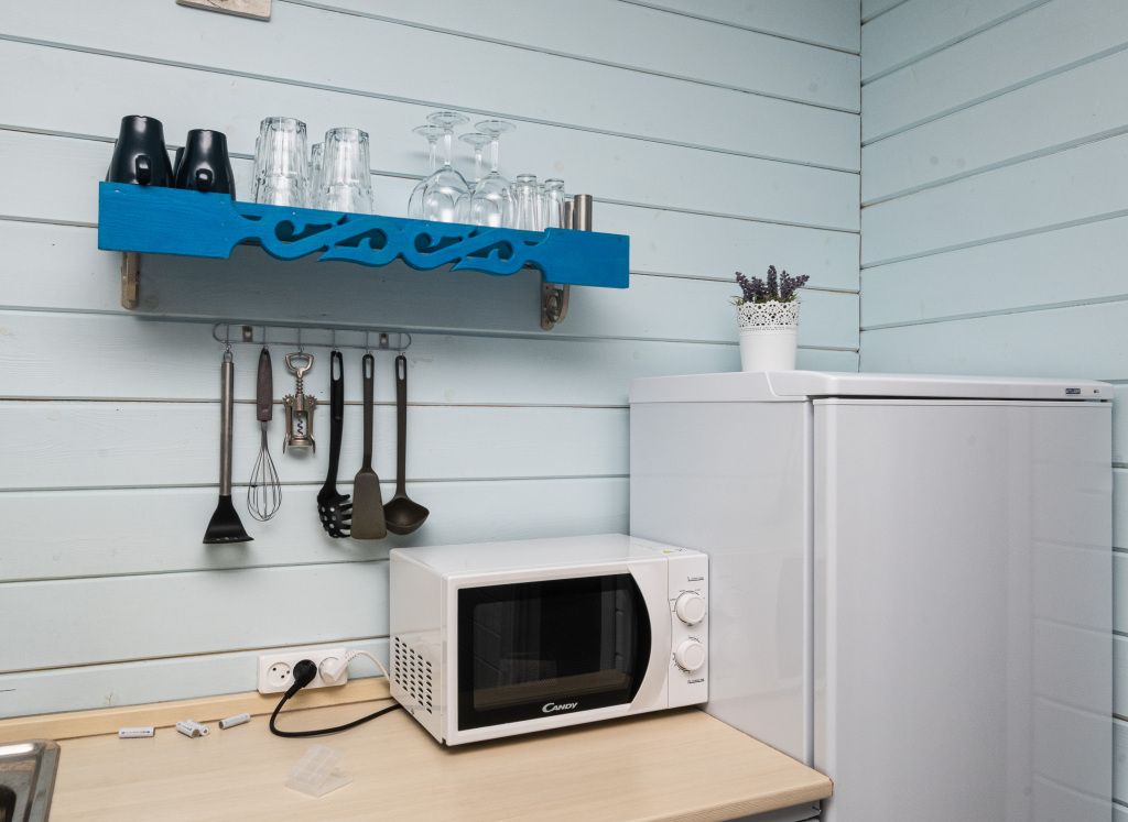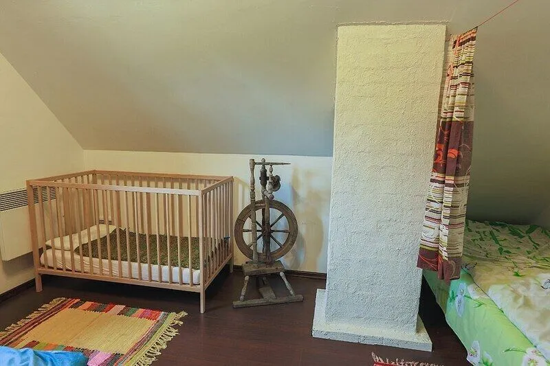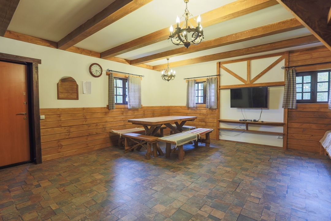 - камин-печь, кровать в виде бочки, деревянный стол с лавками, кухня полностью оборудованная, раздельные туалет и душ.