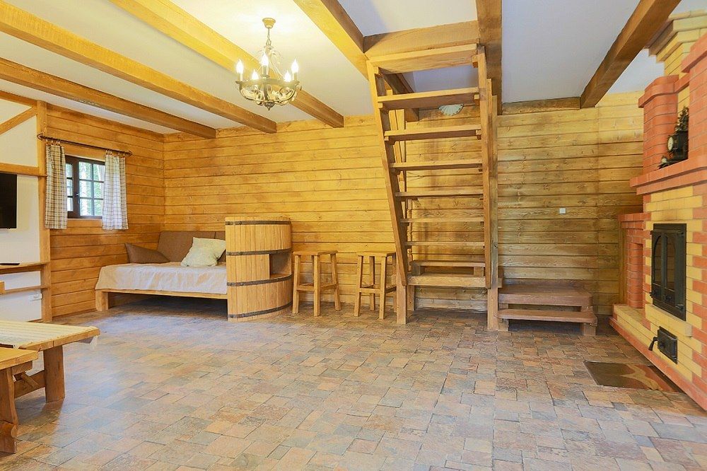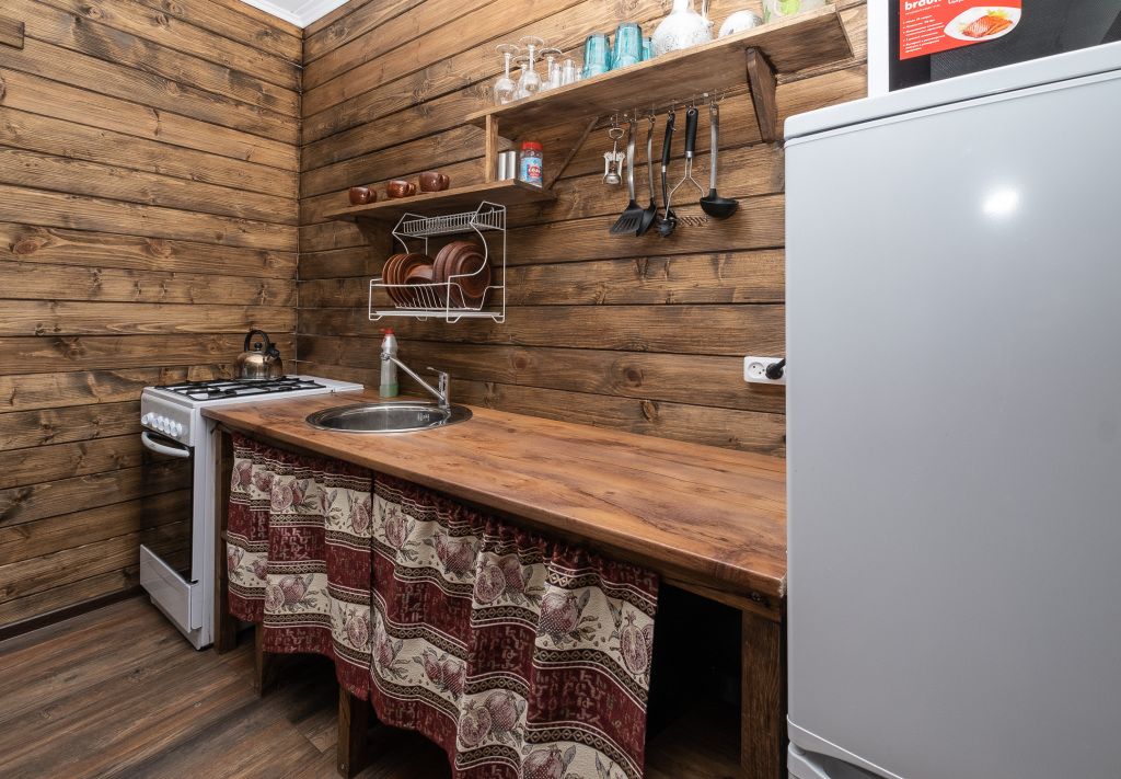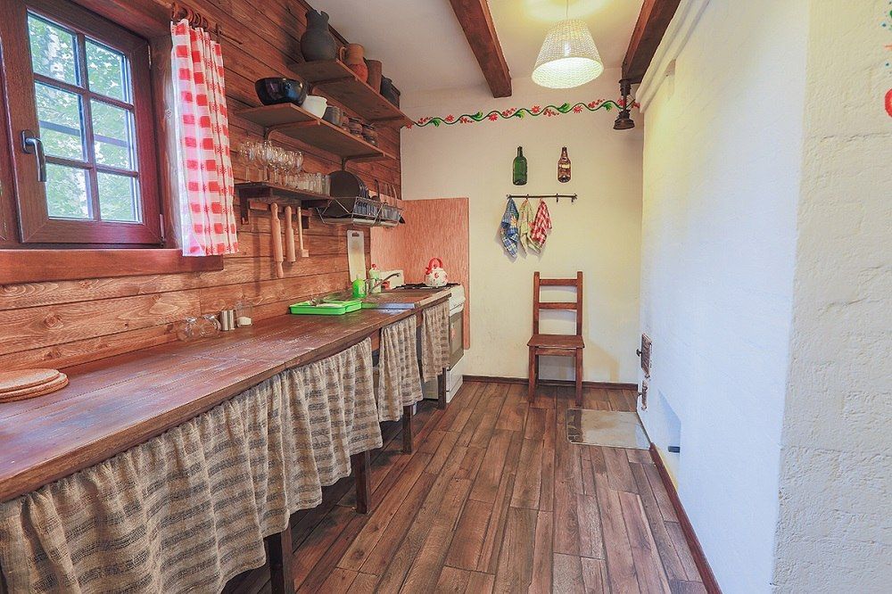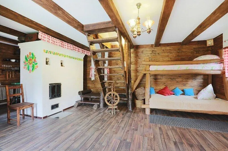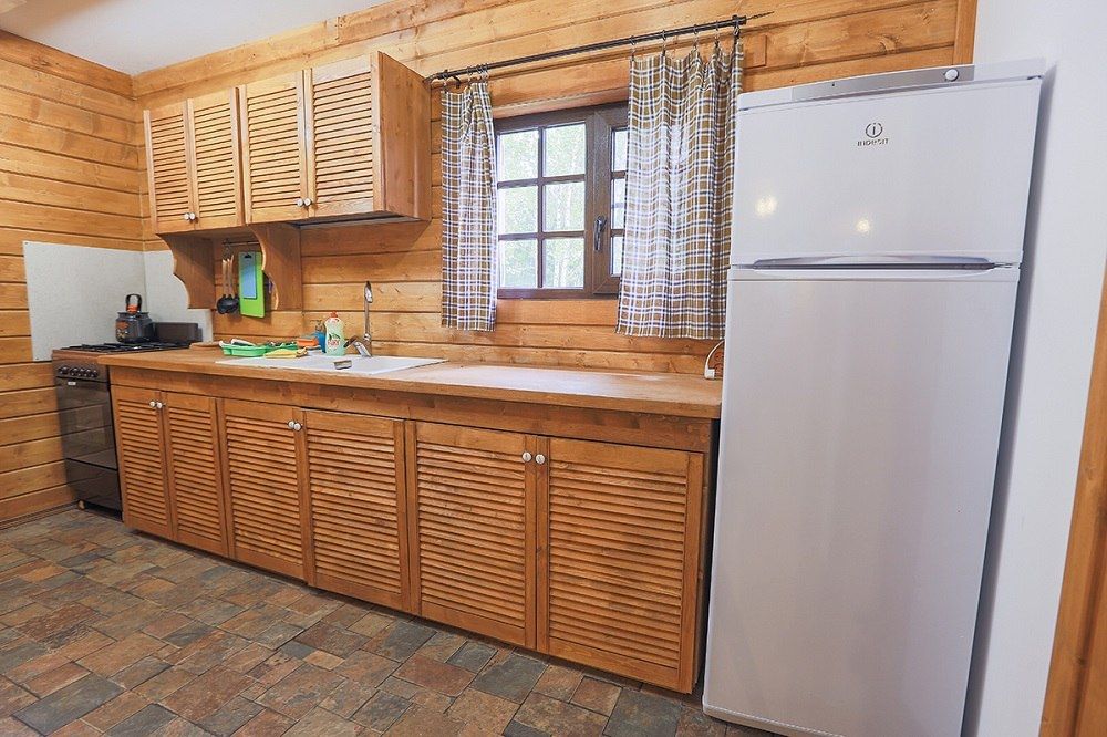- двухъярусная кровать из бревен, кухня со всем необходимым оборудованием и набором посуды, камин, печь;