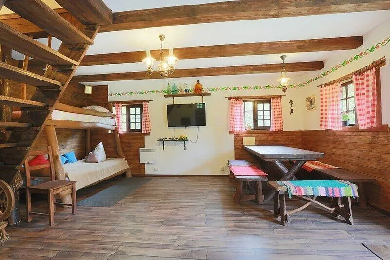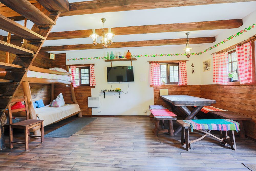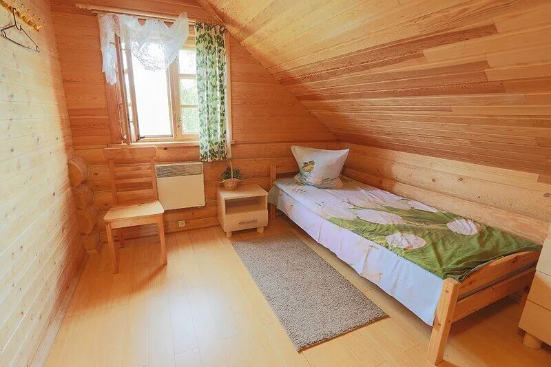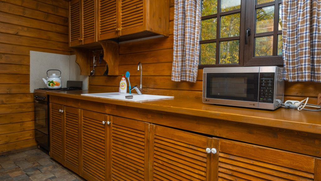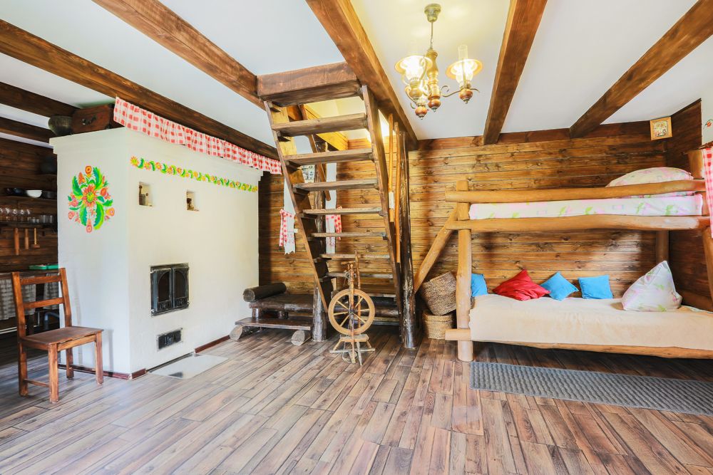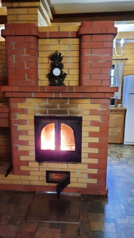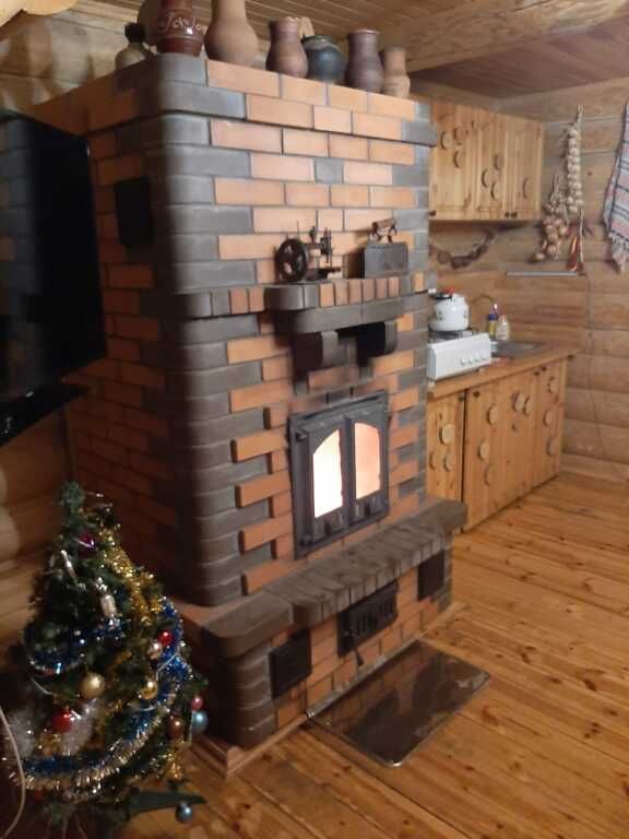 - двухъярусная кровать из бревен, кухня со всем необходимым оборудованием и набором посуды, камин, печь;