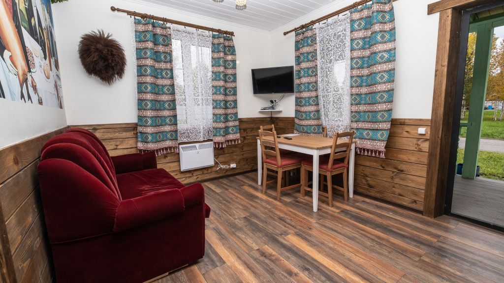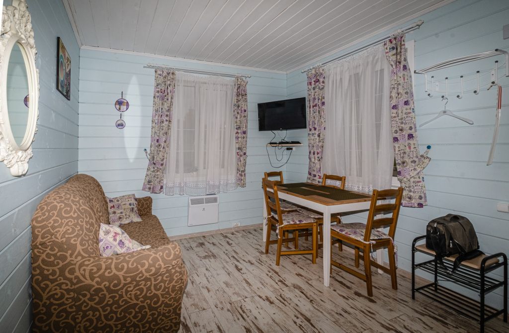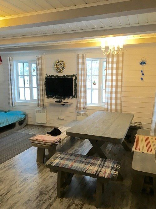 - камин-печь, двуспальная кровать в виде зимних саней, деревянный стол с лавками, полностью оборудованная кухня, раздельные туалет и душевая, новогодняя елка.