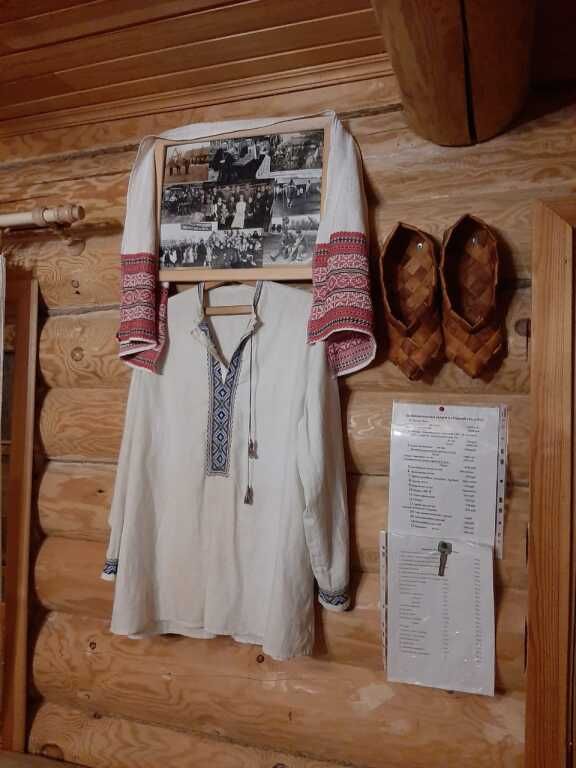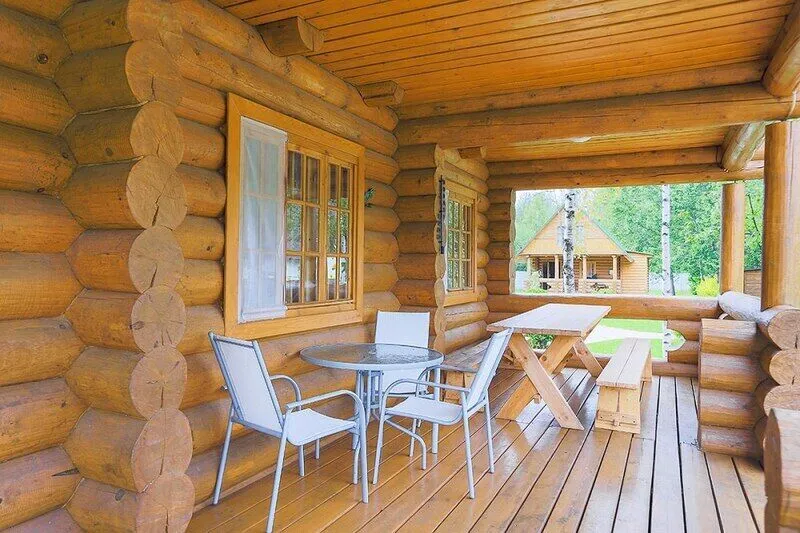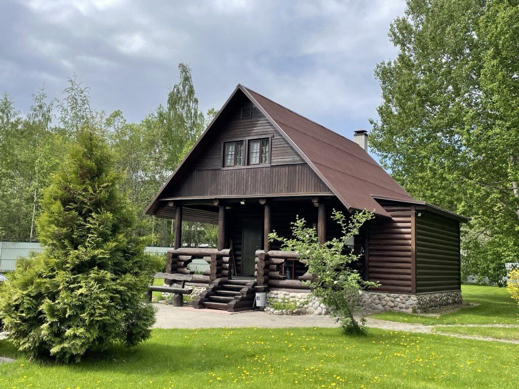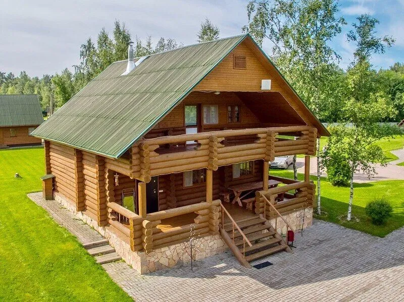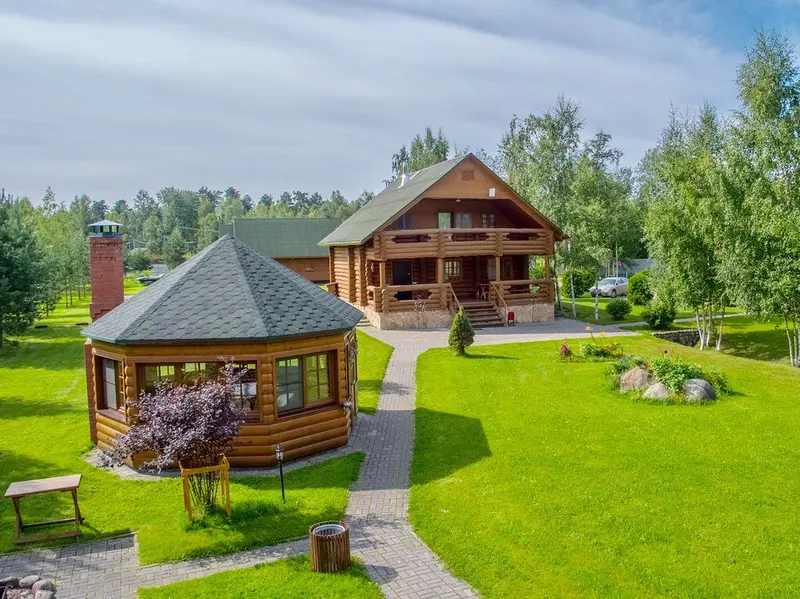 Двухэтажный коттедж из бревна в белорусском стиле, внутри деревянная отделка, предметы старинного деревенского быта. Терраса. Перед домом стоит мангал.