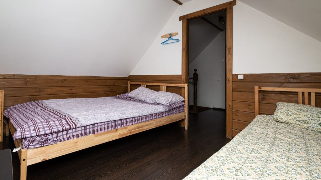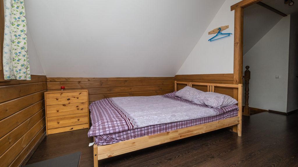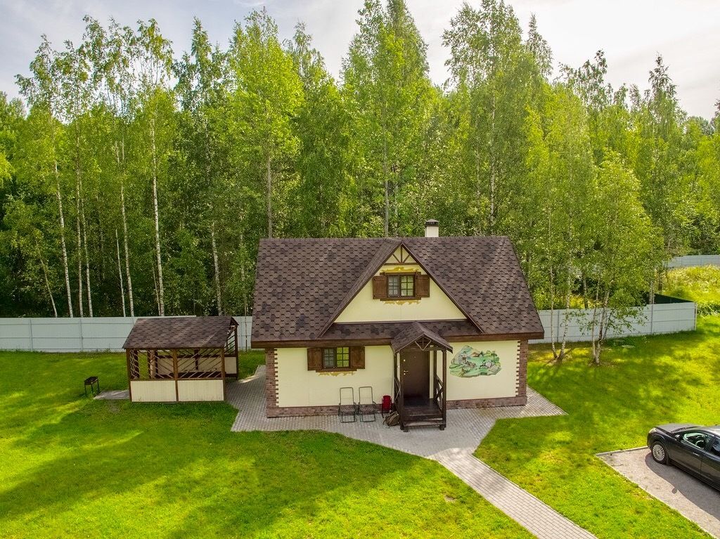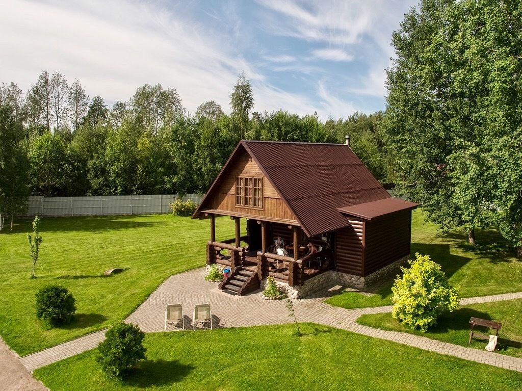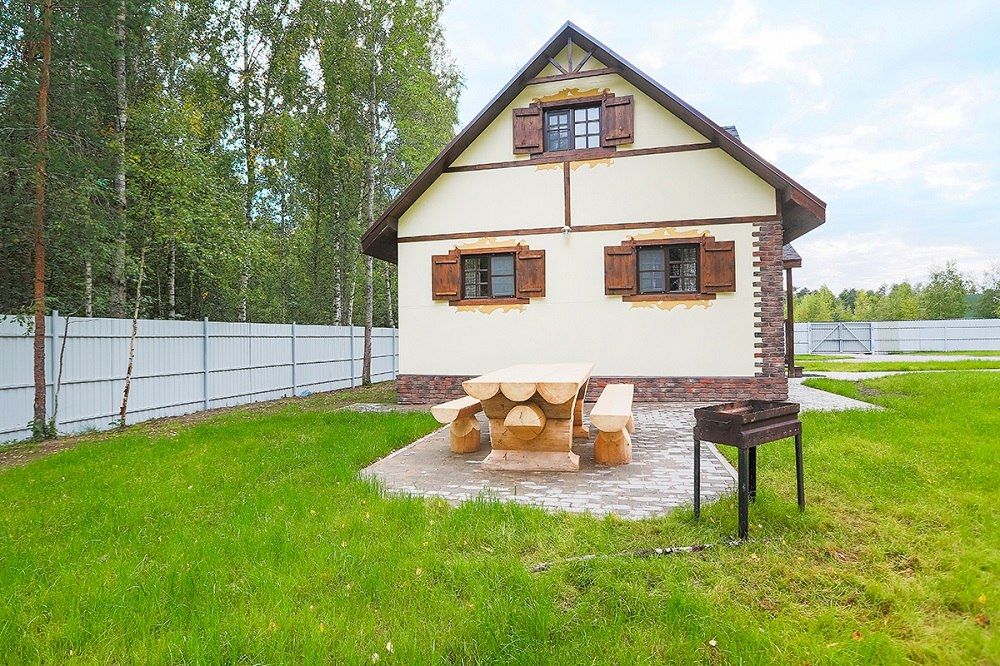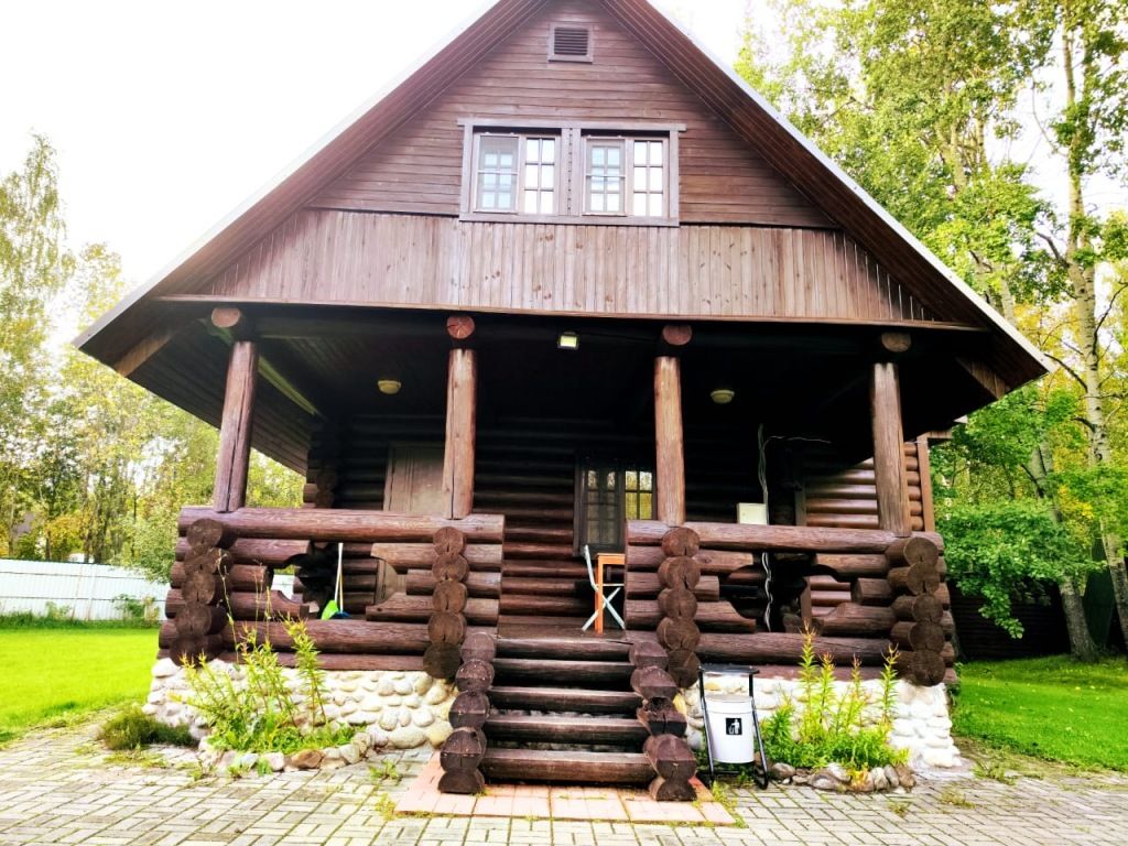 Двухэтажный, из строганого бревна, внутри выполнена отделка деревом. Для отопления используются французские электрические радиаторы, с регулируемой температурой (в каждой комнате), есть дровяной камин в гостиной. Терраса. Перед домом мангал.