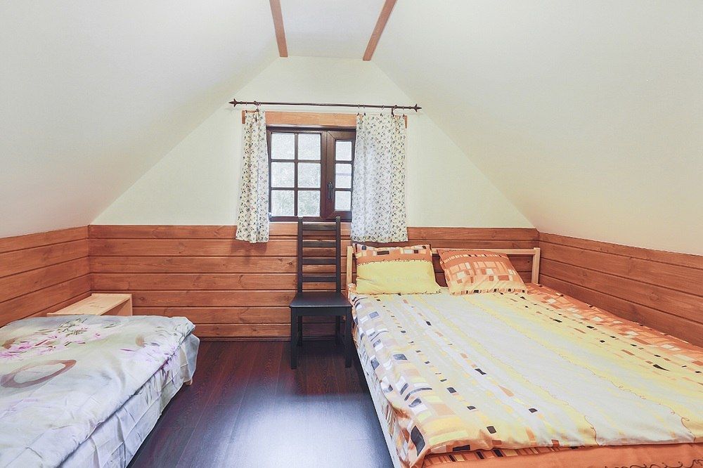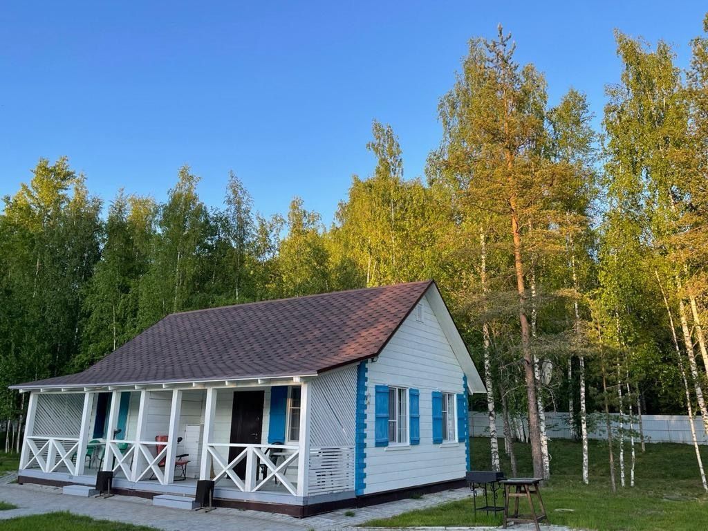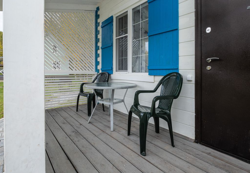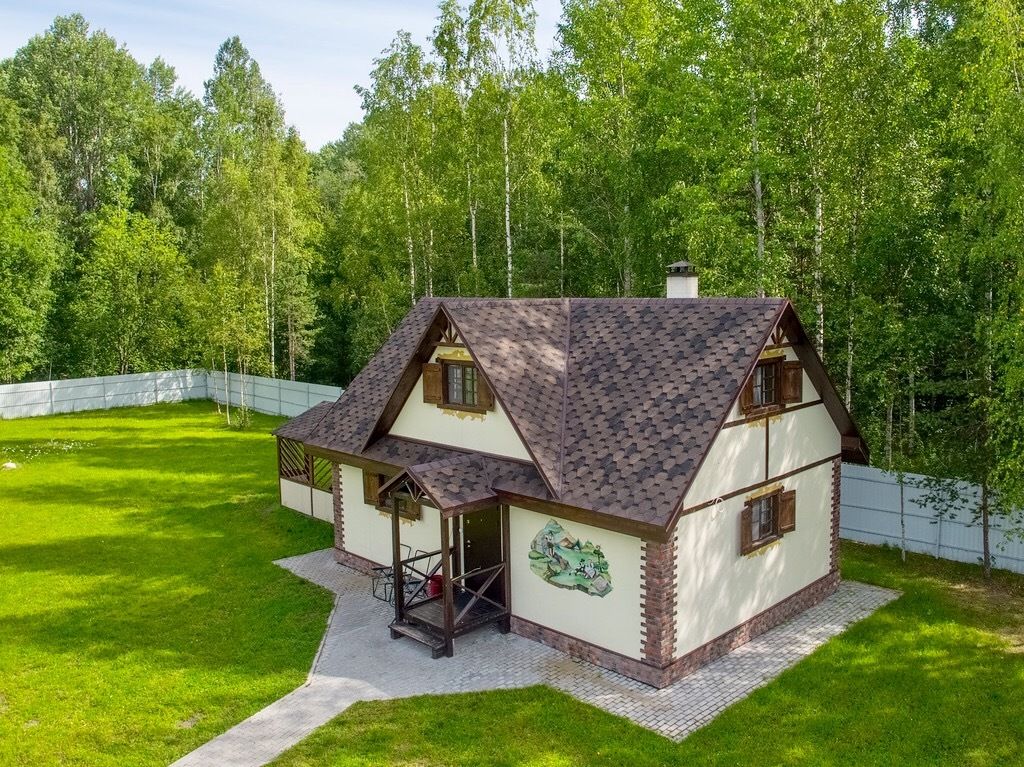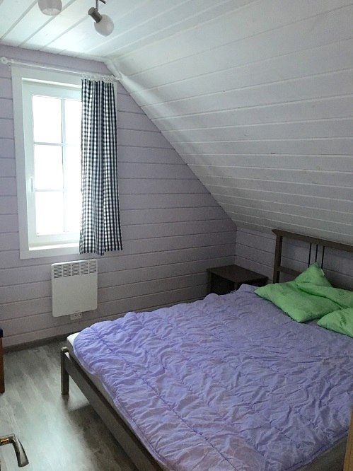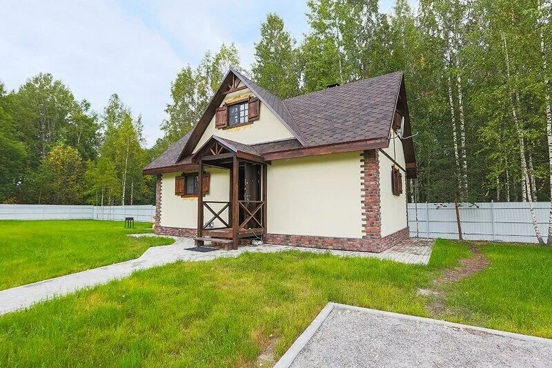Двухэтажный, из строганого бревна, внутри выполнена отделка деревом. Для отопления используются французские электрические радиаторы, с регулируемой температурой (в каждой комнате), есть дровяной камин в гостиной. Терраса. Перед домом мангал.