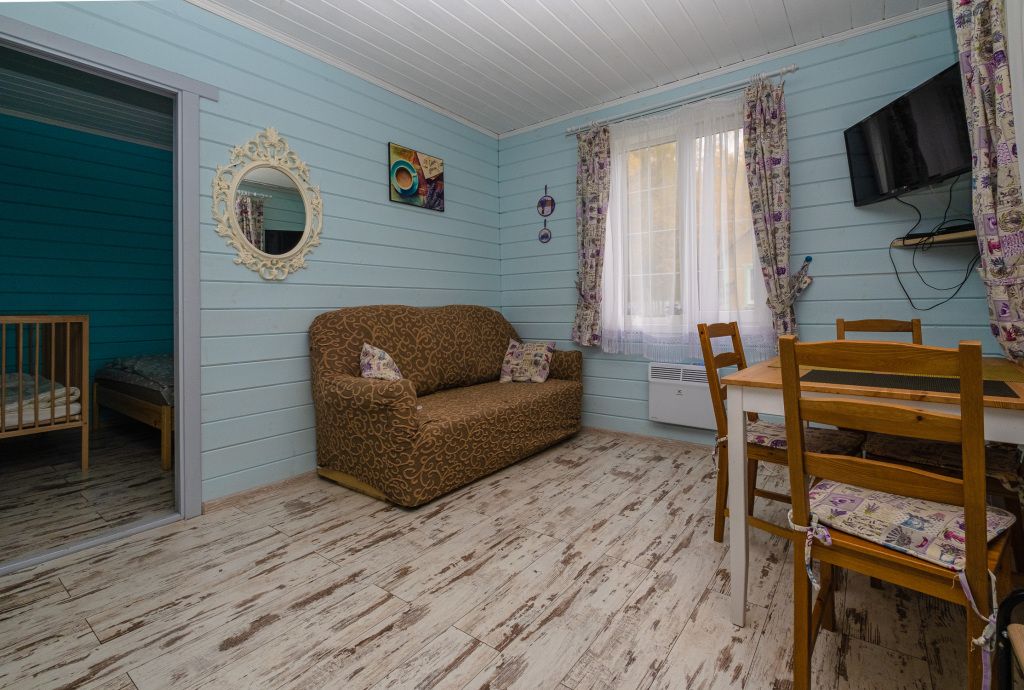 Кухня-гостиная со всем необходимым оборудованием и набором посуды, диван-кровать. Санузел с душевой кабиной. Спальня с двухспальной кроватью и детской кроваткой.