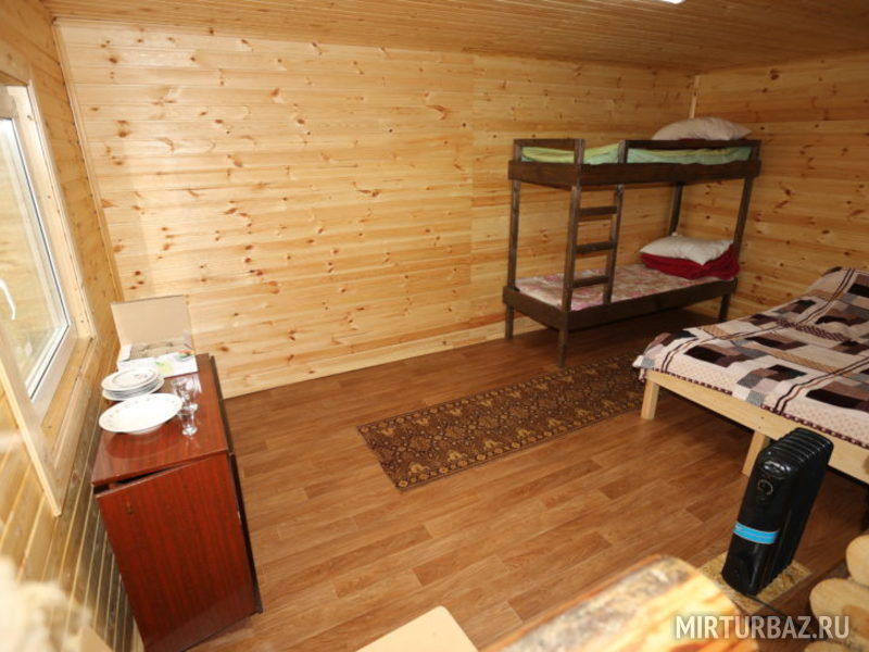 1 этаж: полуторная и двухъярусная кровати, печь на дровах, электричество, умывальник, холодильник, плита, посуда, вентилятор.