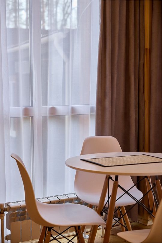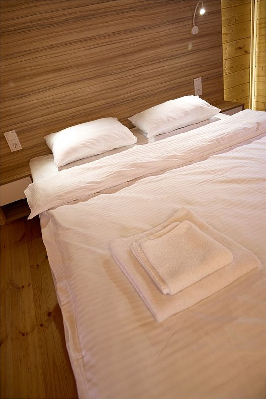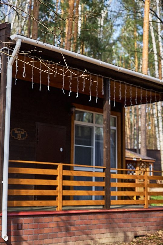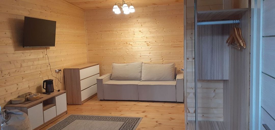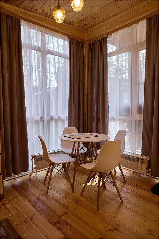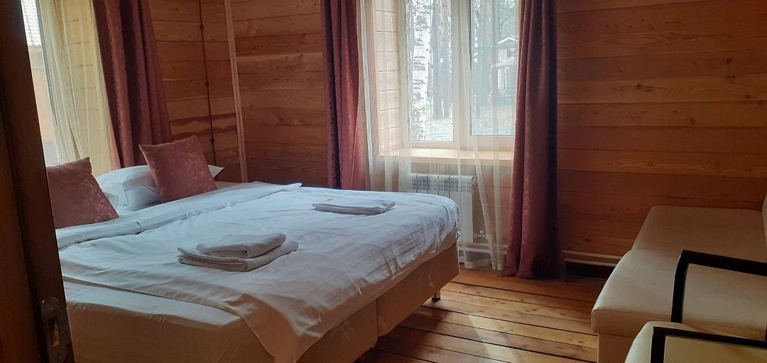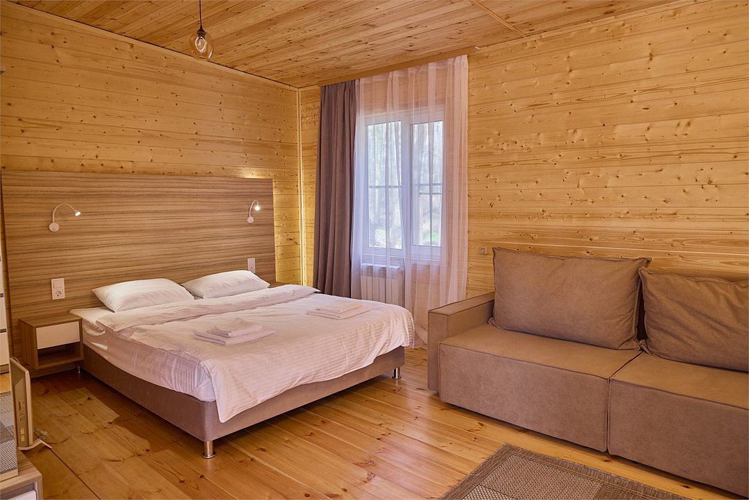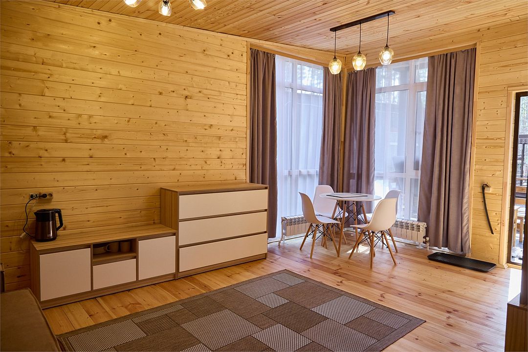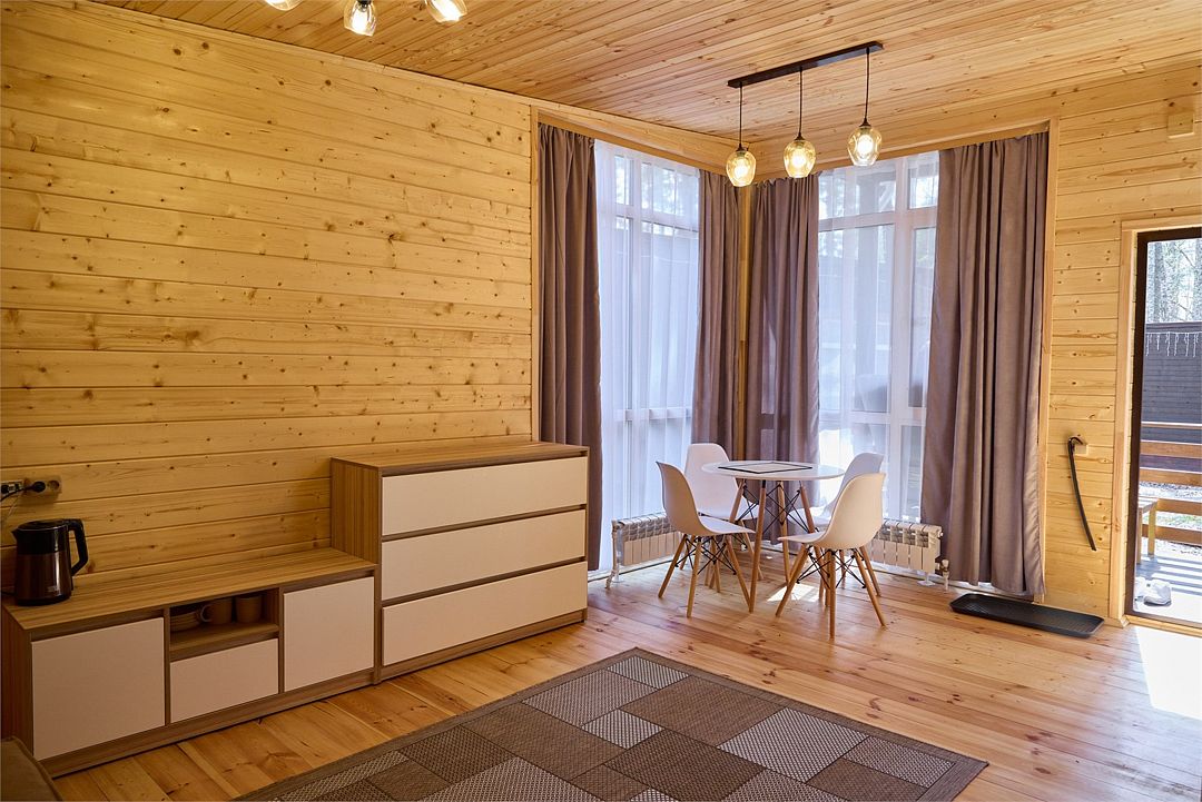 Номер одноэтажный, отдельно стоящий с собственной верандой. Рассчитан на 4 спальных места (удобная двуспальная кровать и мягкий раскладной диван) с панорамными окнами у чайного столика, от пола до потолка, из которых открывается живописный вид на лес и на территорию базы отдыха.