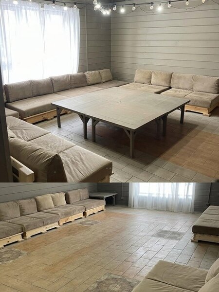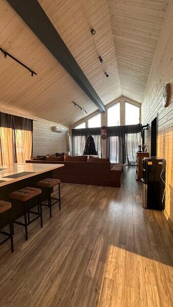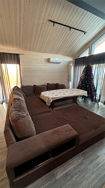 1 этаж: большая современная кухня с посудой, большой зал с мягкими диванами, сауна.