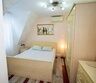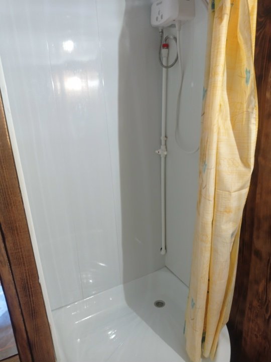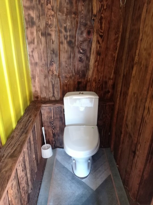 В домике двухспальная кровать и раскладной диван. Кухонька, холодильник, вентилятор, чайник, микроволновка. Душ и санузел.