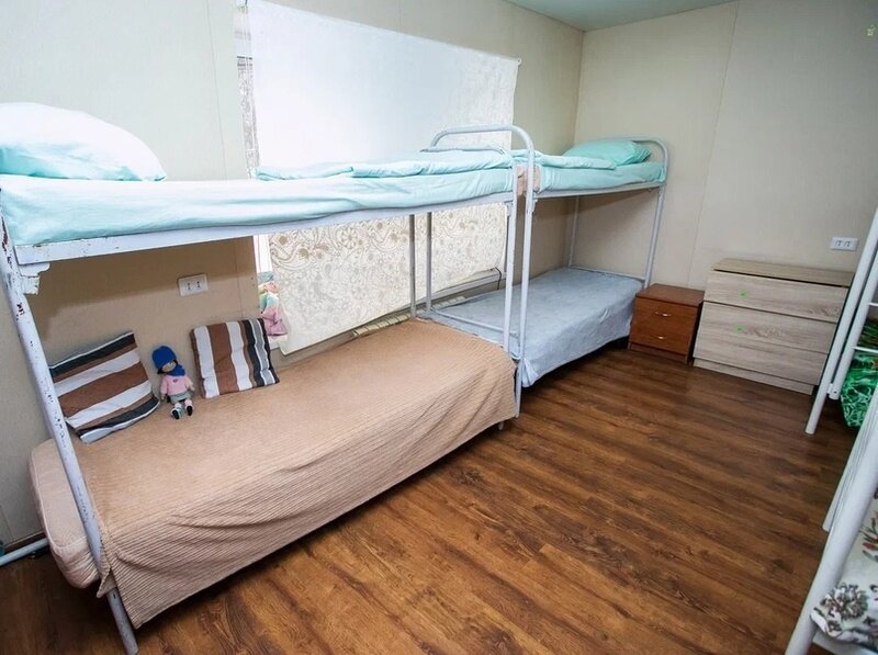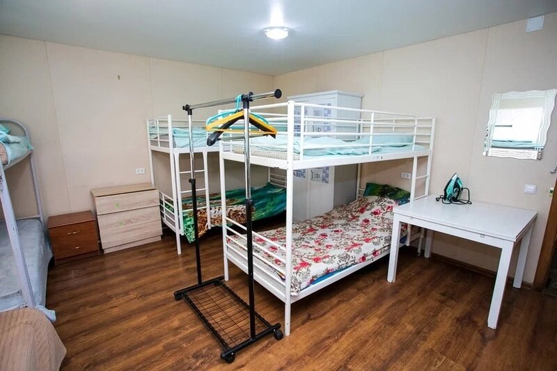 В номере стоят пять двухъярусных кроватей. Два шифоньера, тумбочки и стол. Удобства рядом на этаже.