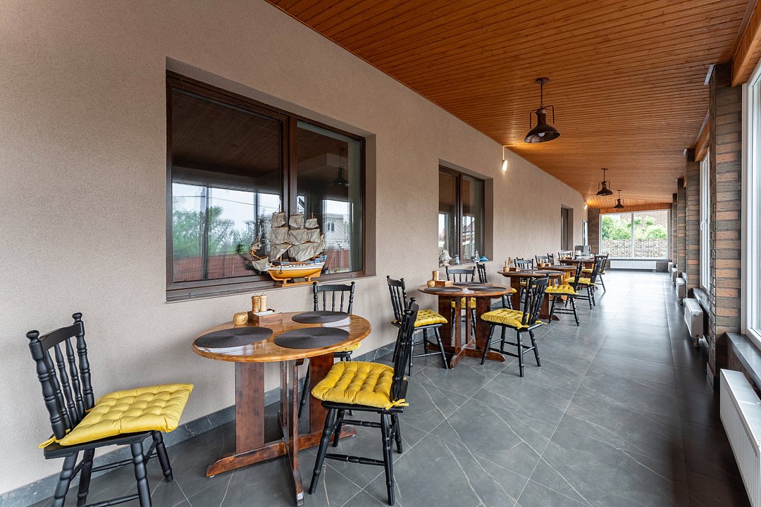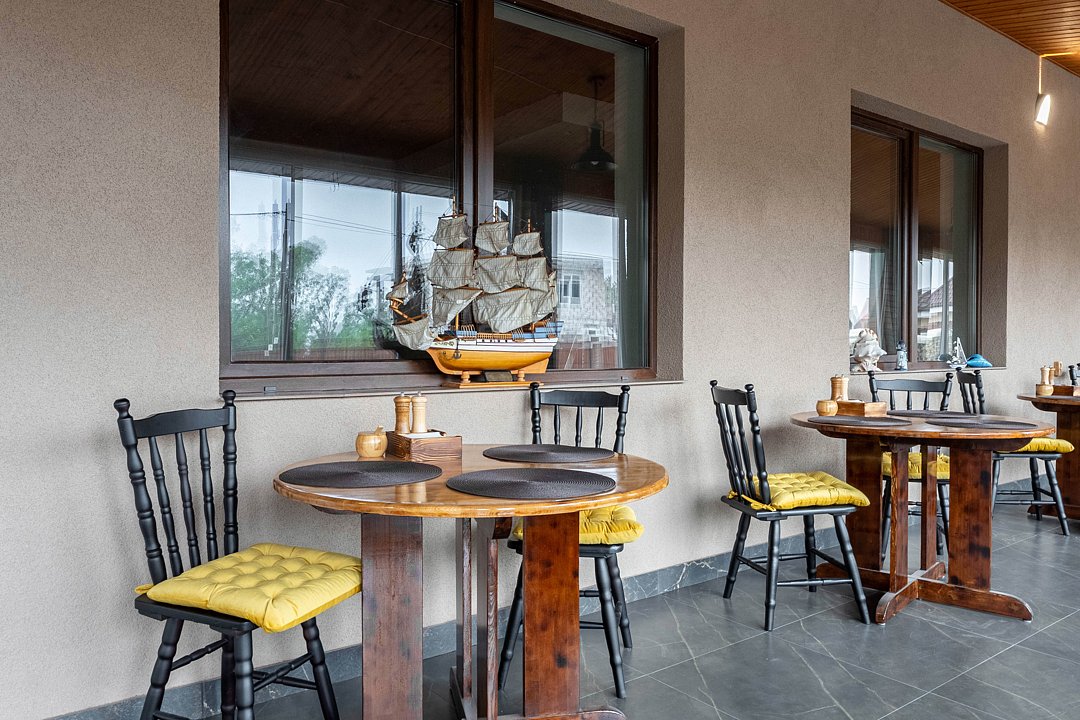 Принимать блюда можно в уютной обеденной зоне с витражными окнами, где приятно собираться за столом.