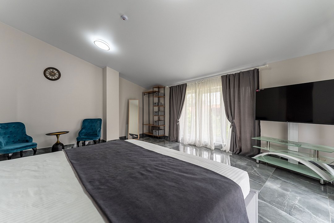 Просторный двухкомнатный номер высшей категории с панорамными окнами и зонированным пространством. Идеален для романтического отдыха, особых событий или комфортного длительного проживания с возможностью размещения дополнительных гостей.