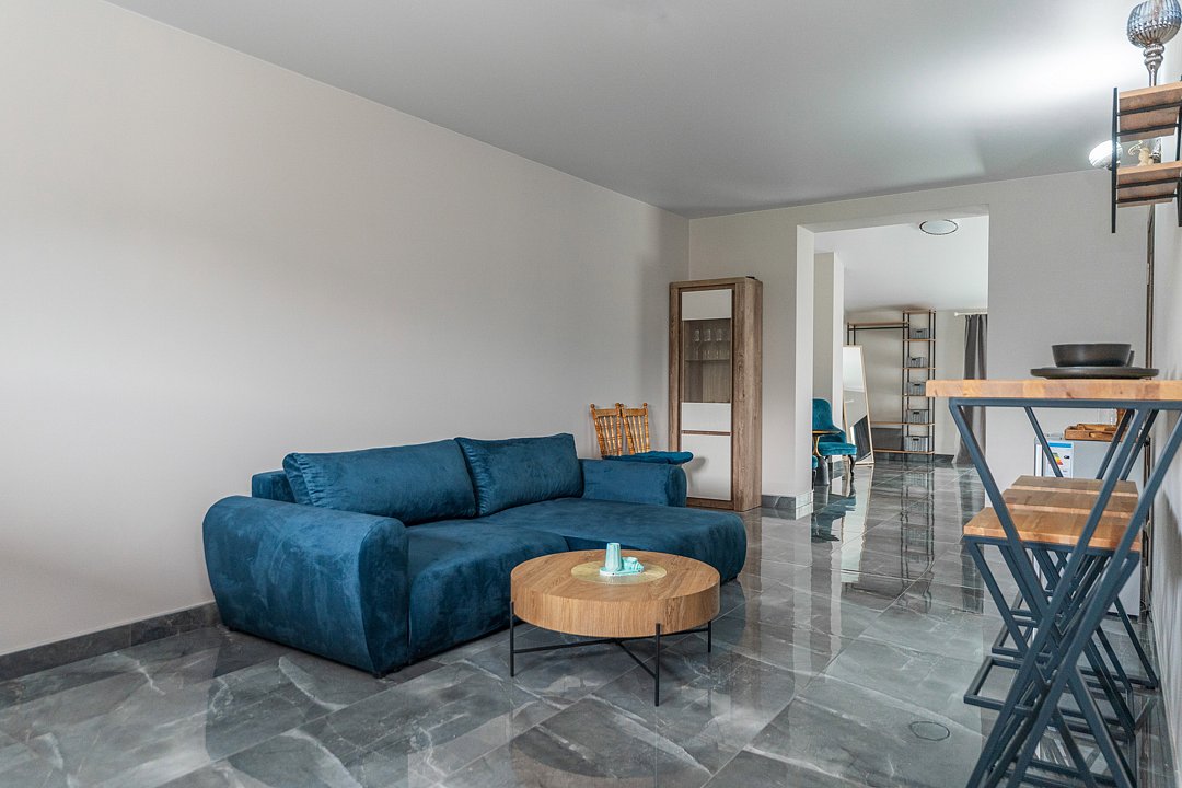 Гостиная: Раскладной диван, журнальный столик, телевизор, барная стойка с двумя стульями, холодильник, телевизор большой