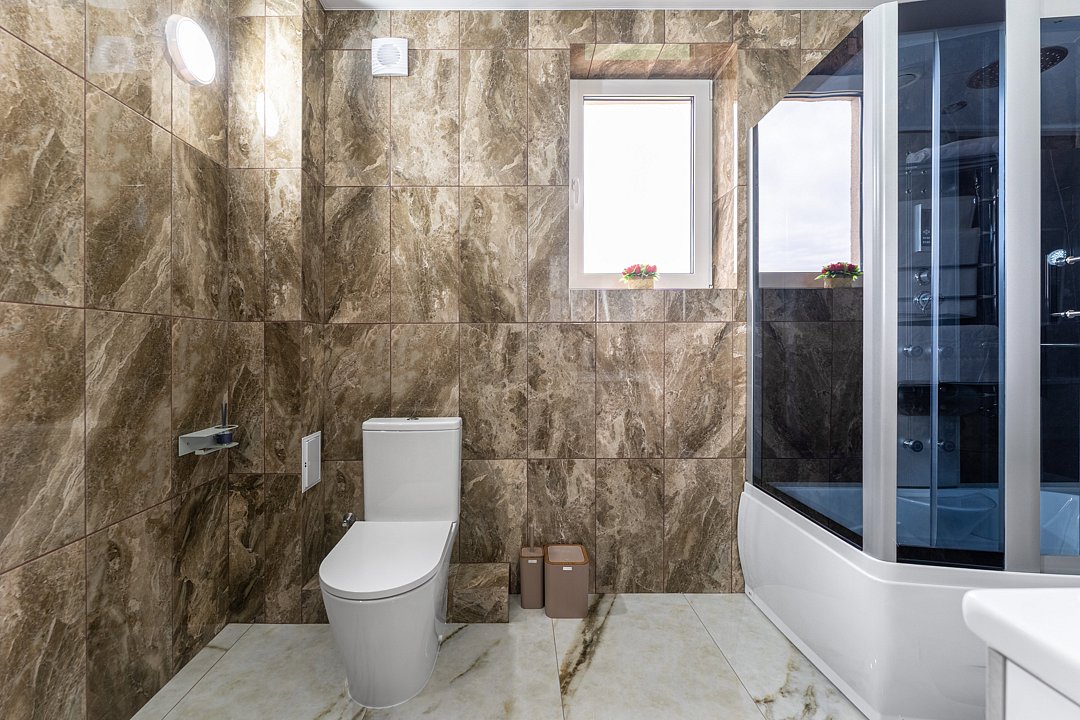 Ванная комната: Просторная комната с большой гидромассажной ванной, отдельная душевая кабина (по желанию можно добавить), два раковины, туалет, халаты, тапочки, набор дизайнерской косметики.