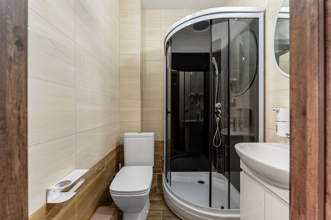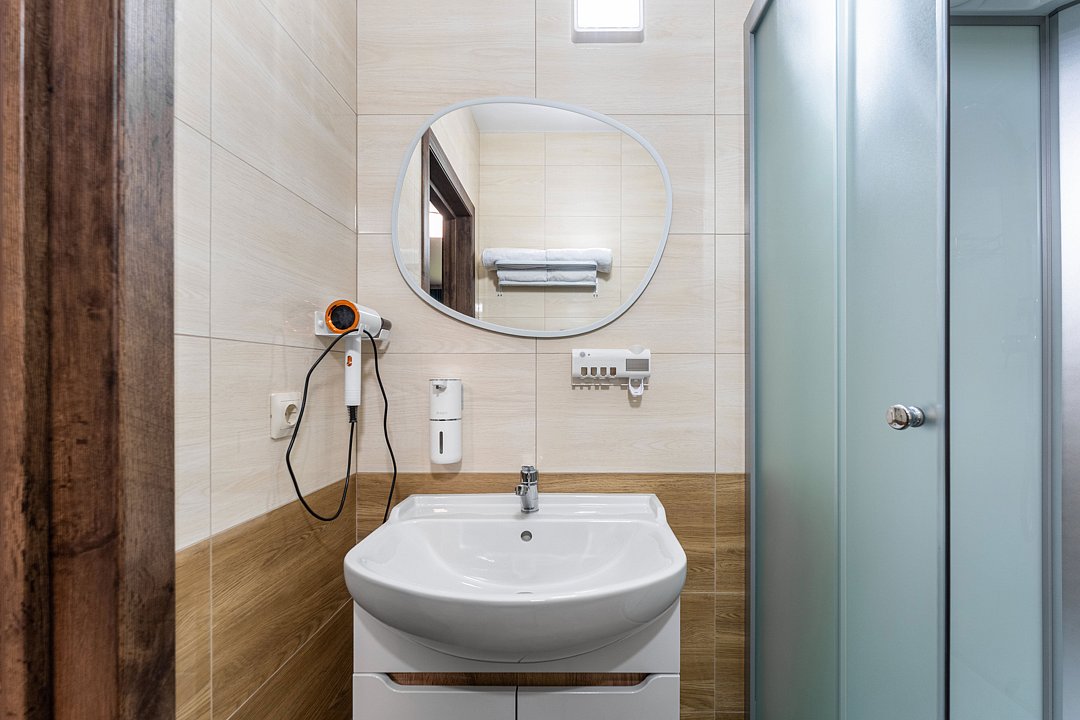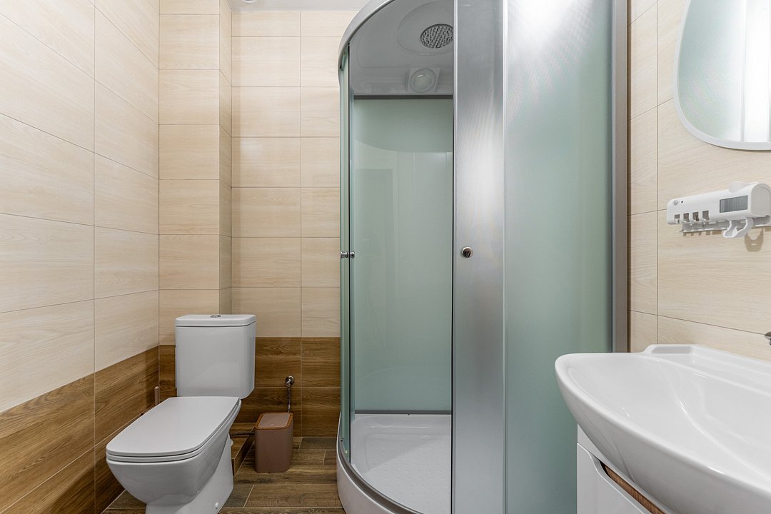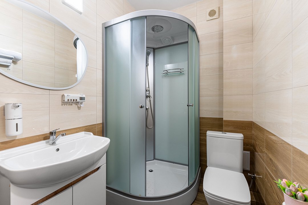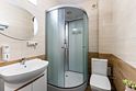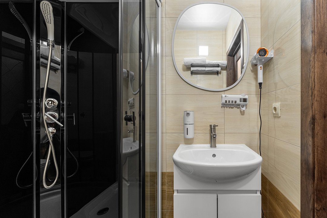 · Душевая кабина, унитаз, раковина с зеркалом и фен.