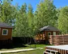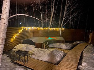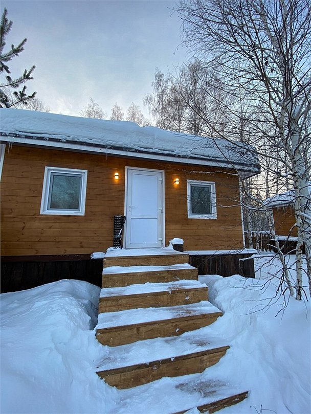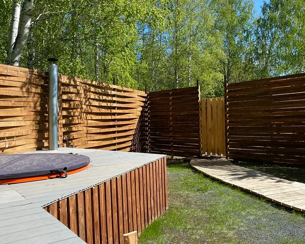 В каждом доме есть все необходимое для комфортного пребывания. В распоряжении отдыхающих финская сауна и горячая купель с гидромассажем. Панорамное окно с подсветкой и с видом на лес добавит положительных эмоций. Каждый домик огорожен высоким забором, что означает полную приватность вашего отдыха.