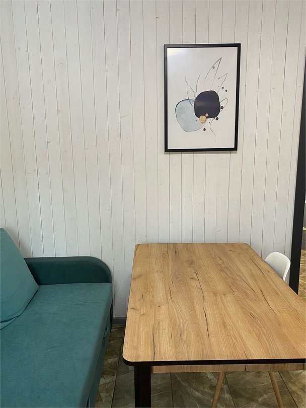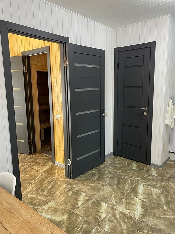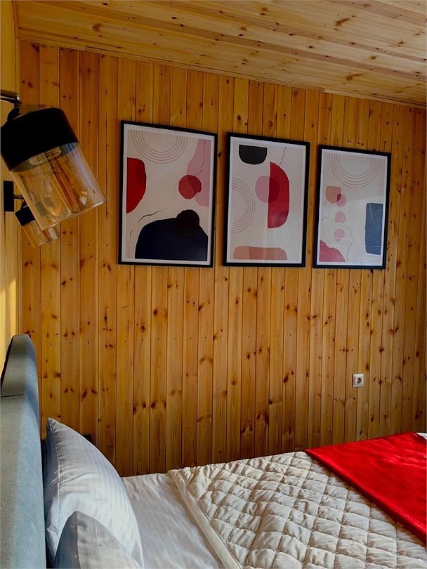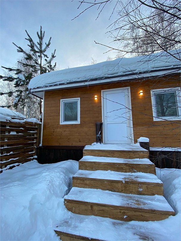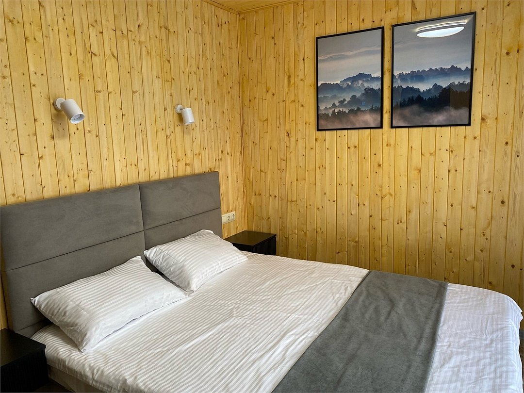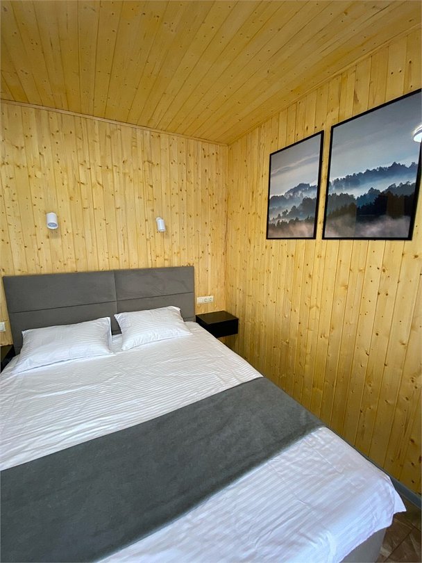 Панорамное окно в спальне. Двуспальная кровать, раздвижной диван, кухня, холодильник, свч, кофеварка, плита, чайник и санузел с душем. Домик оборудован электрическим конвектором, всегда будет тепло! Также в доме есть сауна с оборудованным душем. На территории домика имеется купель и мангальная зона.