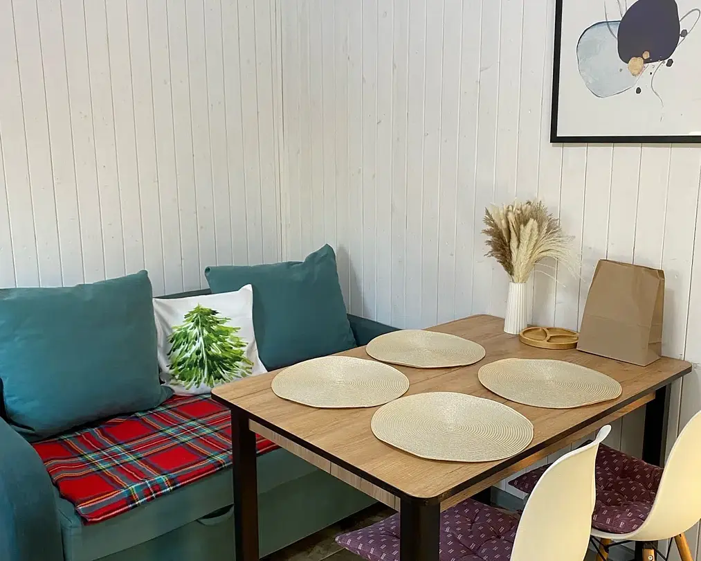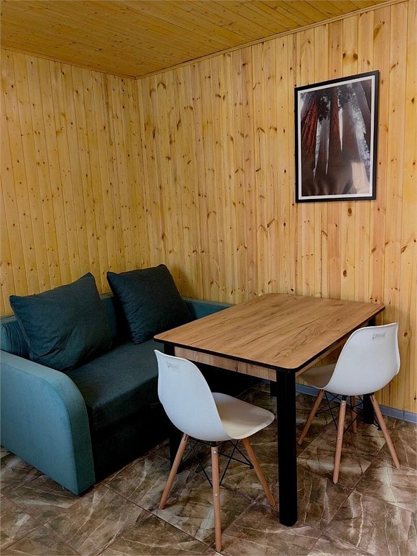 Уютный четырехместный домик Гармония с сауной для спокойного семейного отдыха. В домике есть небольшая кухонная зона со всей необходимой техникой (чайник, плита индукция, тостер, кофеварка капельная, СВЧ, холодильник), душевая, туалет — раздельные, 2сп кровать с видом на лес, раздвижной диван в столовой зоне. Во дворе - мангальная зона, купель с подогревом и гидромассажем, территория огорожена забором. В домике вас ждет приветственный бонус: авторский чай, орехи, мед.