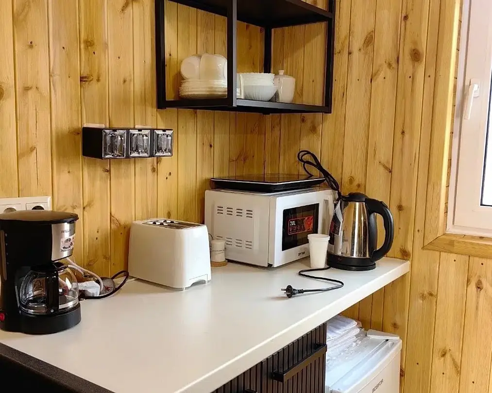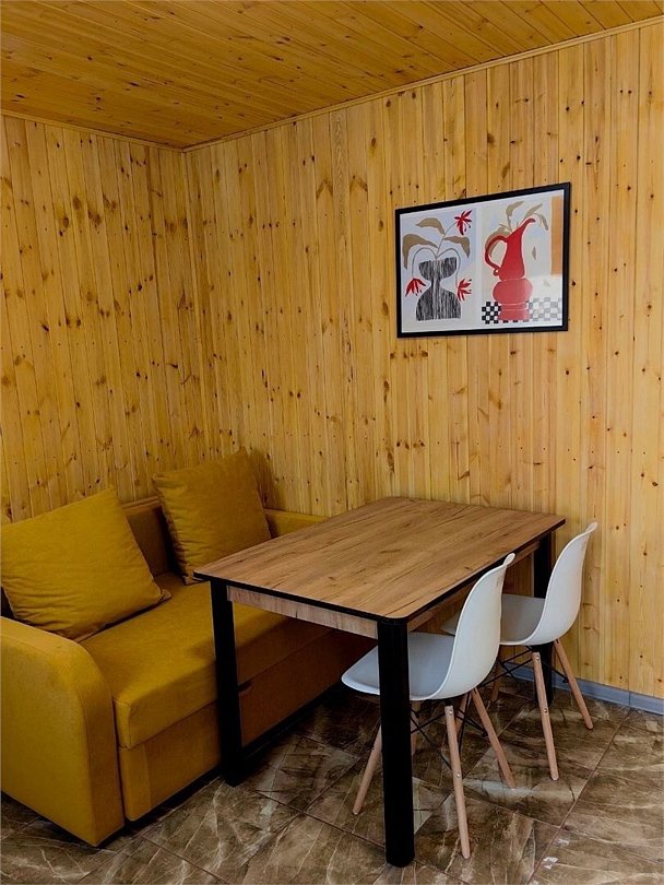 Уютный четырехместный домик Гармония с сауной для спокойного семейного отдыха. В домике есть небольшая кухонная зона со всей необходимой техникой (чайник, плита индукция, тостер, кофеварка капельная, СВЧ, холодильник), душевая, туалет - раздельные, 2сп кровать с видом на лес, раздвижной диван в столовой зоне. Во дворе – купель, которую можно топить при любой температуре воздуха, и мангальная зона, территория огорожена забором. В домике вас ждет приветственный бонус: авторский чай, орехи, мед.
