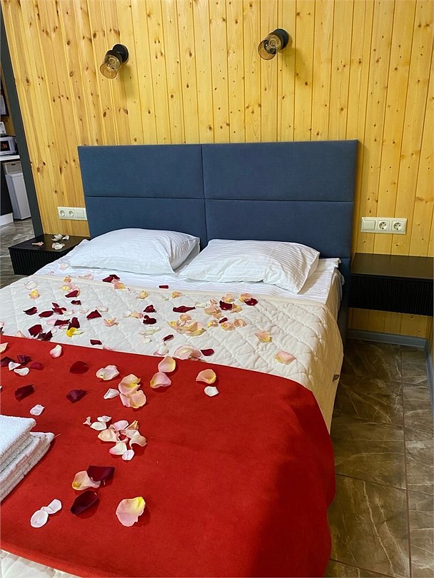 Только для Вас: заезд и выезд в удобное время (после торжества свадьбы или в вечернее время), домик и купель в лепестках роз, цветы, легкий ужин (фрукты, мясная (халяль) и сырная нарезка), безалкогольные напитки.