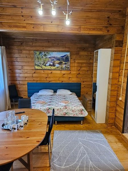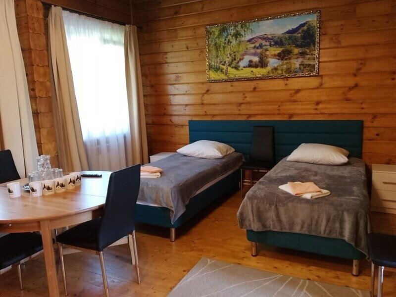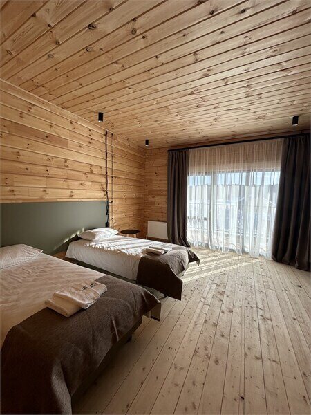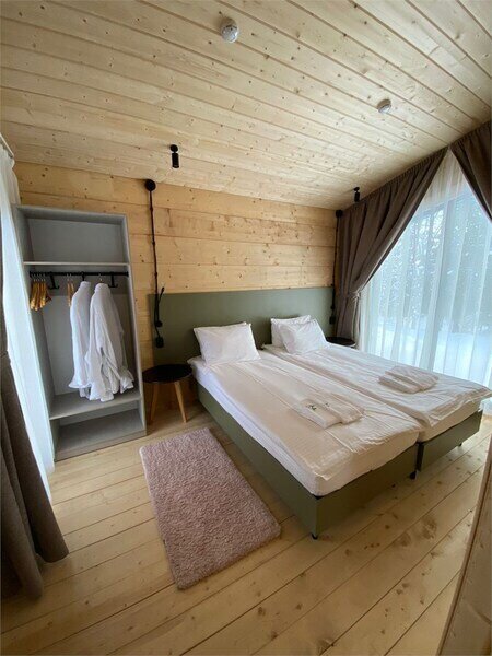 Уютный домик для комфортного проживания 2-3 человек. Вы можете выбрать домик с двумя односпальными кроватями или одной большой двуспальной кроватью.