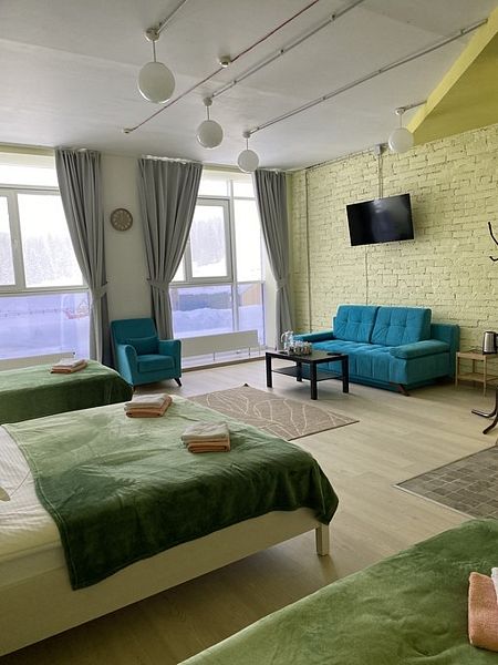 Отличный выбор для компании или семьи до 5 человек - просторный номер, предназначенный для проживания большой группы. Включено постельное белье и комплекты полотенец.
