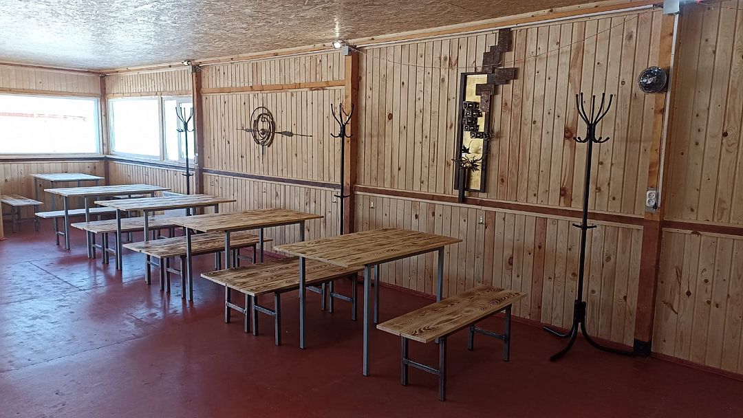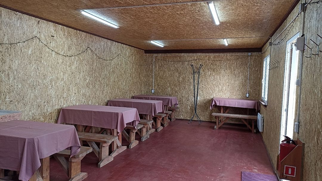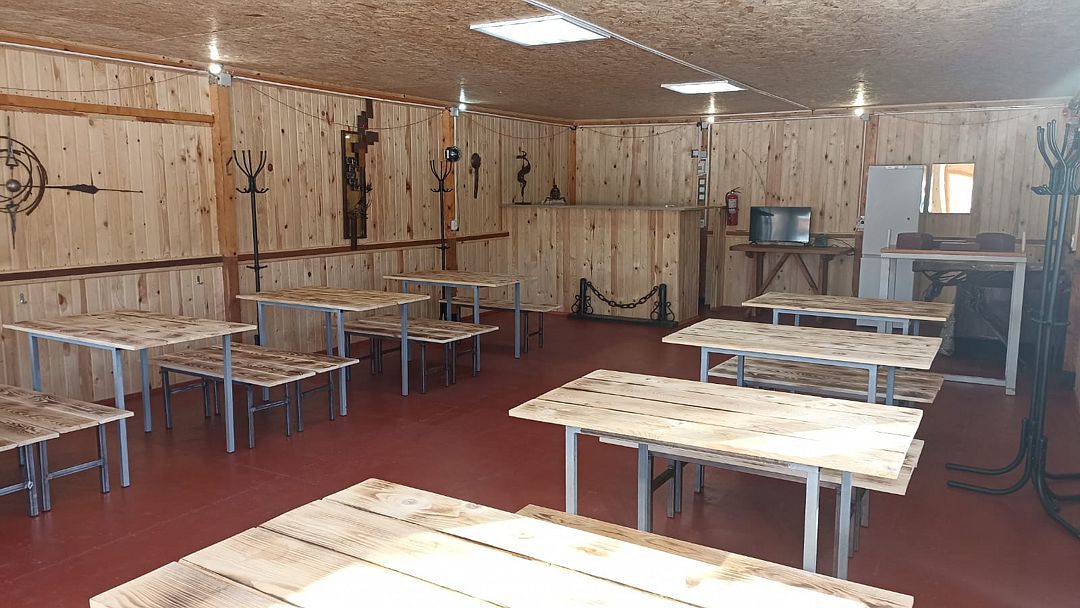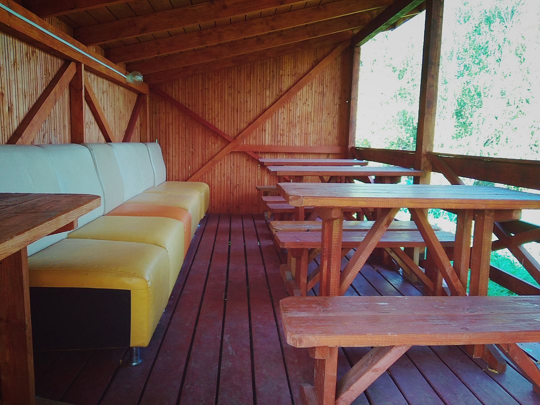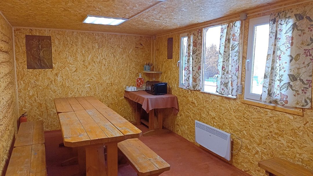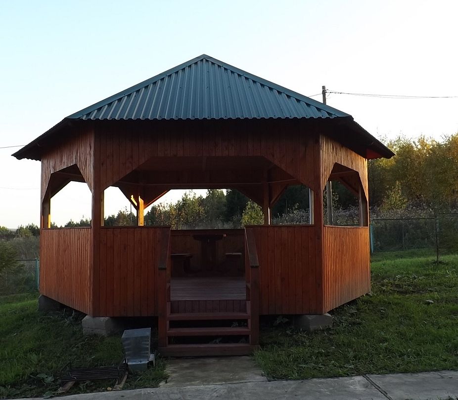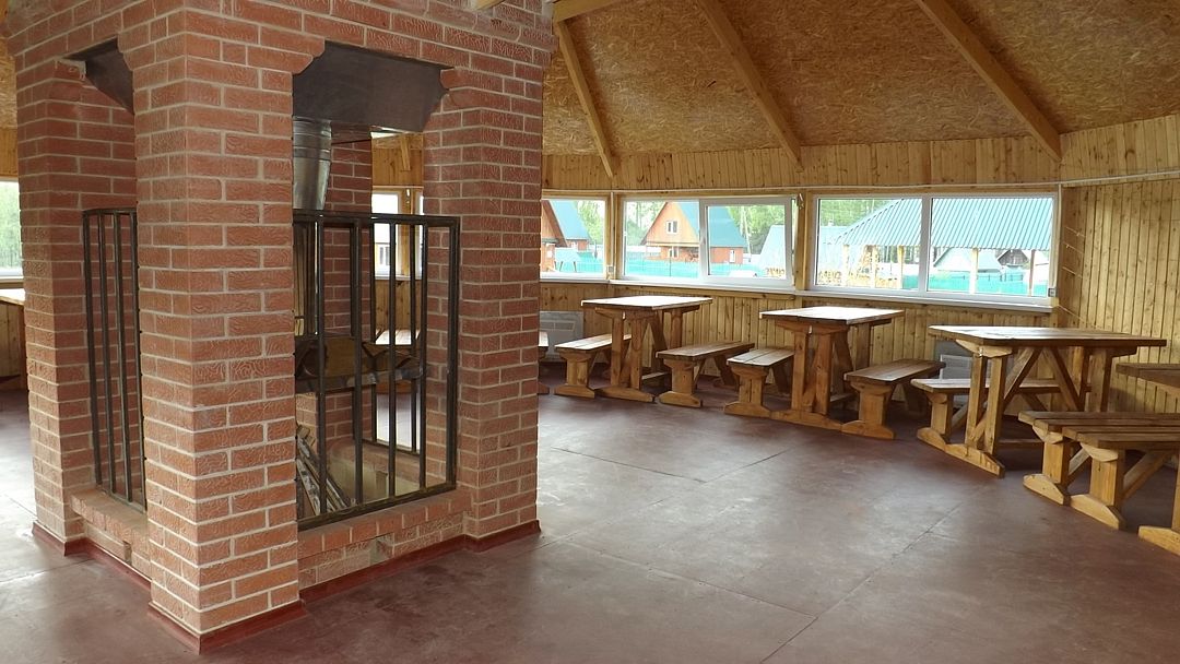 В беседке деревянные столы и лавки, барная стойка, холодильник, микроволновая печь, чайник, настольная газовая плитка, электрообогреватели. Есть возможность подключения аппаратуры. В стоимость включено пользование мангалом, учагой для казана.