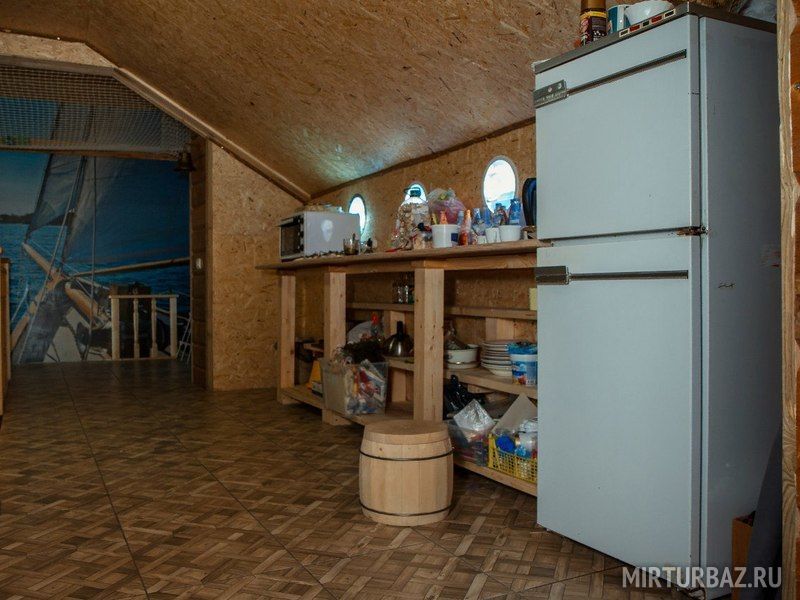 Формат квартиры студии. Тематический интерьер. До 22 спальных мест, кухня, гостиная, два сан-узла. 1 и 2-х спальные места в виде палуб под сводом крыши, раскладные диваны в виде сундуков, гостиная для застолья. Весь третий этаж гостиницы.