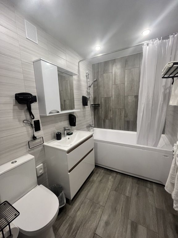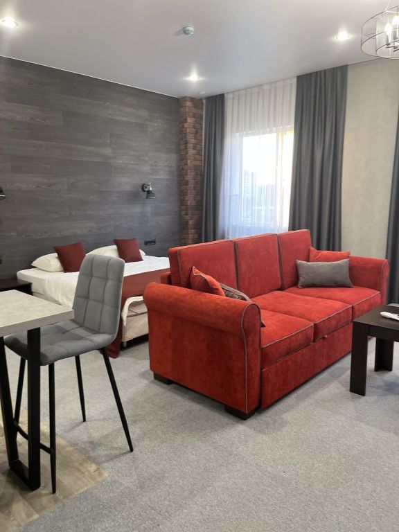 Студия - это прекрасный выбор для тех, кто любит везде чувствовать себя как дома. Просторный номер-студия включает в себя: гостиную зону, кухню с кухонными принадлежностями, кровать King-size, большой телевизор, шторы блэк-аут для спокойного сна, гладильные принадлежности, холодильник с морозильной камерой, микроволновая печь, кондиционерУслуги и удобства