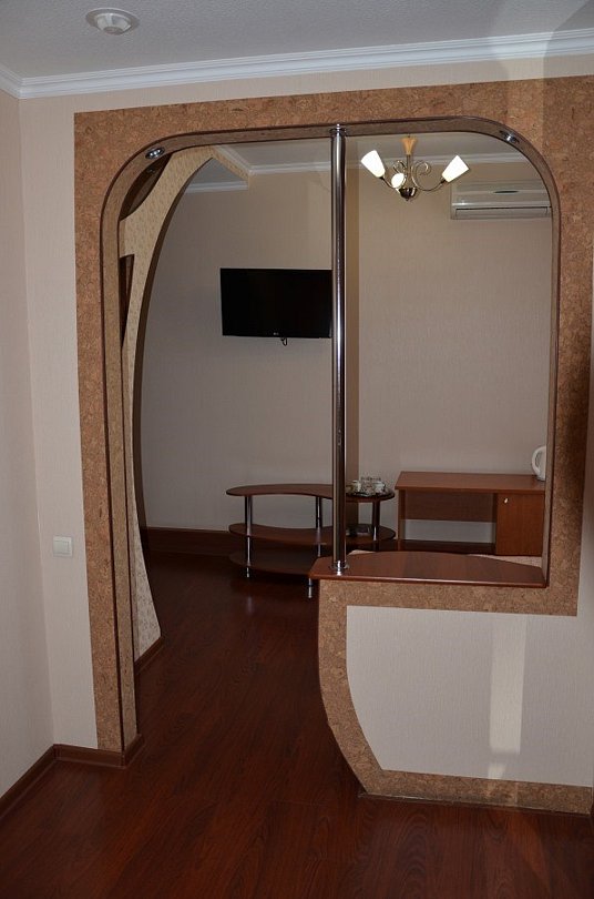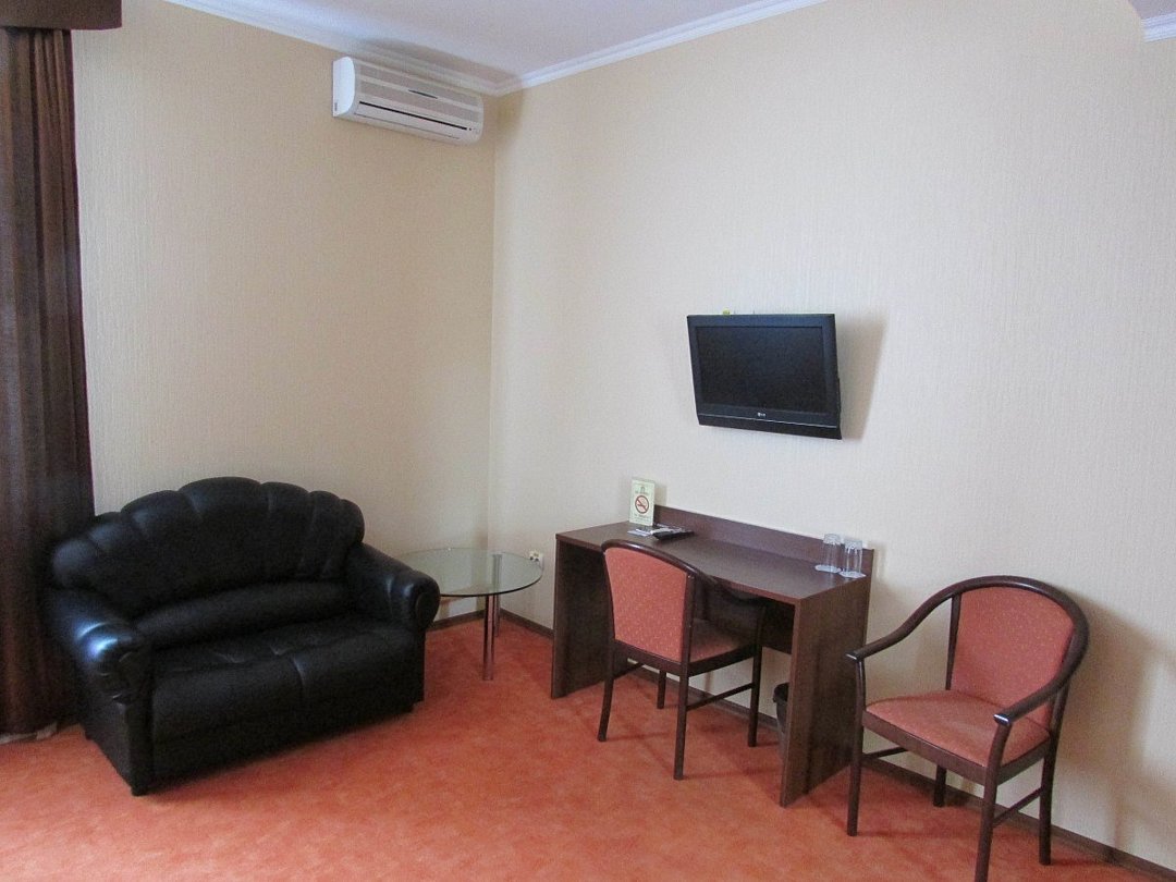 Wi-Fi, кондиционер, фен, ванная комната, ванна, санузел, биде, халаты, банные полотенца, тапочки, двуспальная кровать, диван, журнальный столик, зеркало, две комнаты, чайный набор, обслуживание номеров, информационная карта, меню, сейф, чайник, унитаз, раковина, косметическое зеркало, гостиная зона, вид на город, кулер на этаже, ламинат, стаканы, стул, туалетные средства, туалет, внутренний телефон, телевизор с плоским экраном, мини-холодильник, шкаф-купе, гостиничная парфюмерия, номер для некурящих, можно с питомцамиВ номере