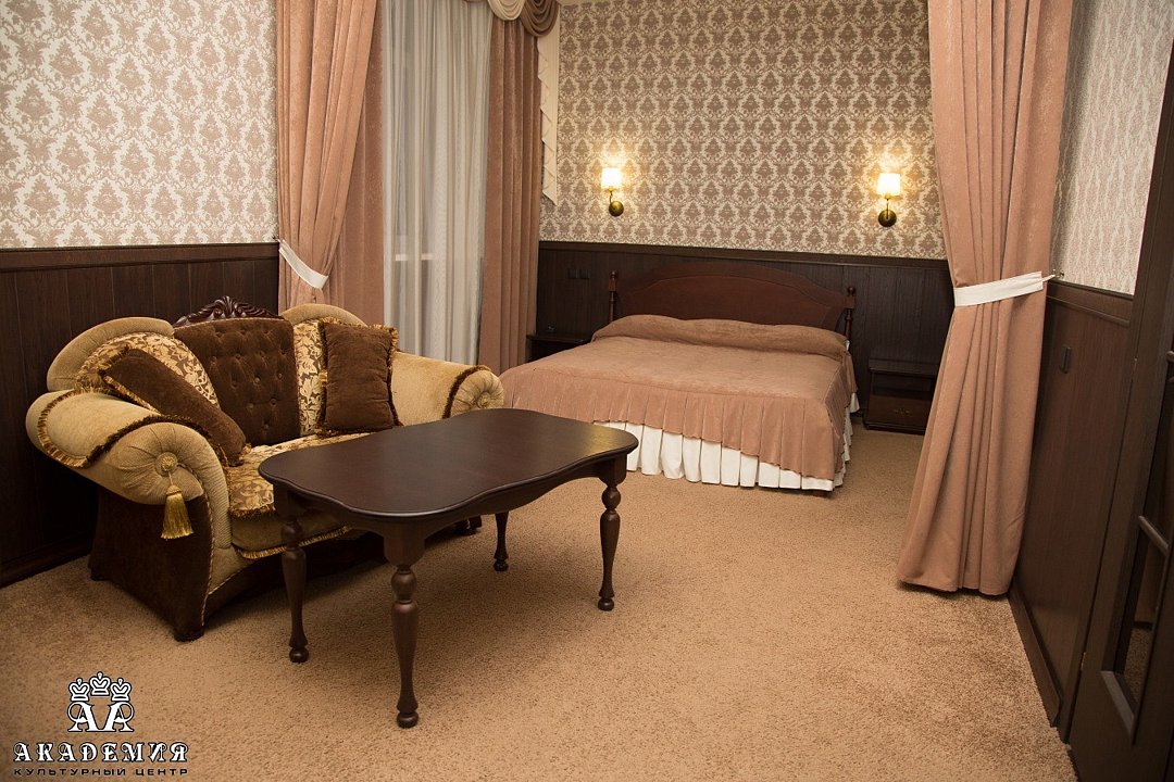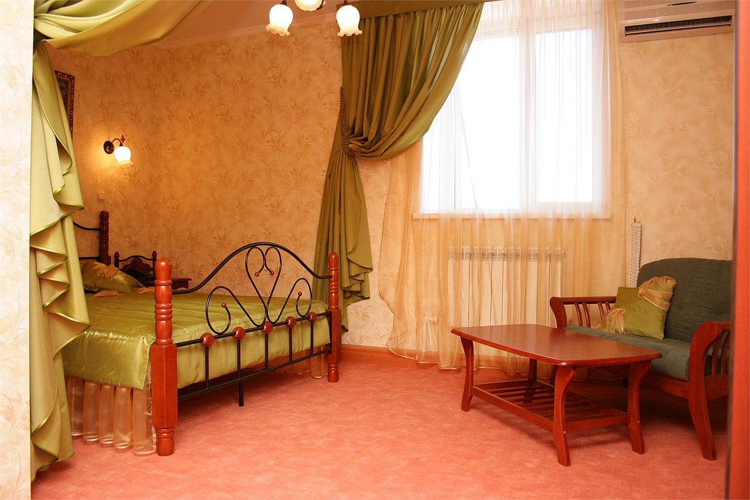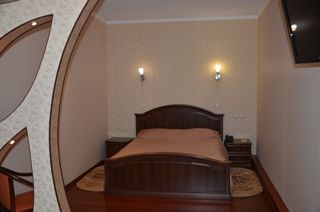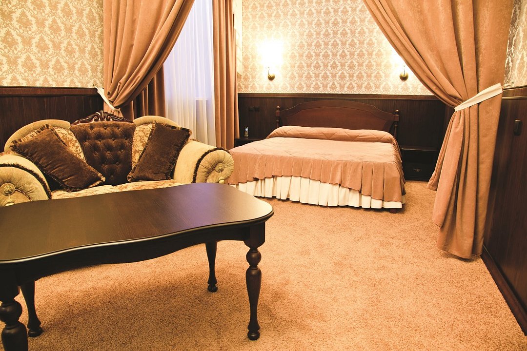 Wi-Fi, кондиционер, фен, ванная комната, ванна, санузел, биде, халаты, банные полотенца, тапочки, двуспальная кровать, диван, журнальный столик, зеркало, ковер, две комнаты, письменные принадлежности, чайный набор, обслуживание номеров, информационная карта, меню, сейф, чайник, унитаз, раковина, мягкая мебель, косметическое зеркало, гостиная зона, ковровое покрытие, кулер на этаже, вид во двор, ламинат, стаканы, туалетные средства, туалет, внутренний телефон, телевизор с плоским экраном, мини-холодильник, гостиничная парфюмерия, номер для некурящих, пуфик, можно с питомцамиВ номере