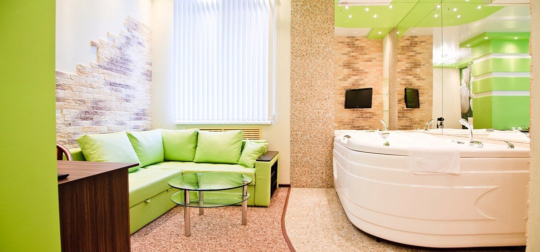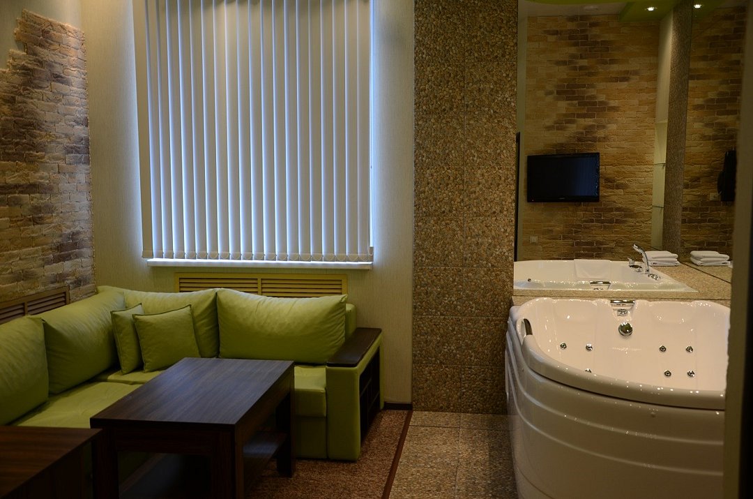 два телевизора, Wi-Fi, кондиционер, ванная комната, душевая кабина, ванная с джакузи, халаты, банные полотенца, тапочки, полутораспальная кровать, вешалки, журнальный столик, письменный стол, багажная тумба, зеркало, две комнаты, письменные принадлежности, чайный набор, обслуживание номеров, информационная карта, меню, сейф, унитаз, раковина, гостиная зона, ковровое покрытие, душ, кулер на этаже, плиточное покрытие, вид во двор, стаканы, туалетные средства, туалет, раскладной диван, внутренний телефон, мини-холодильник, шкаф-купе, номер для некурящих, можно с питомцамиВ номере