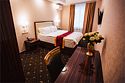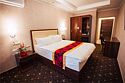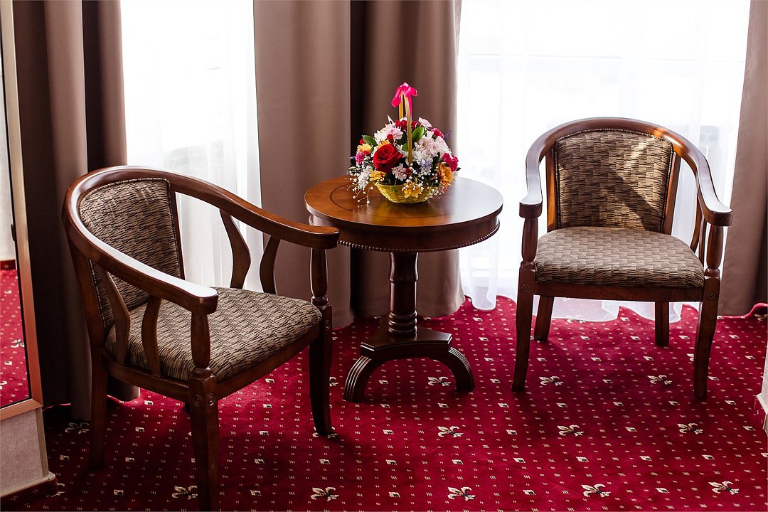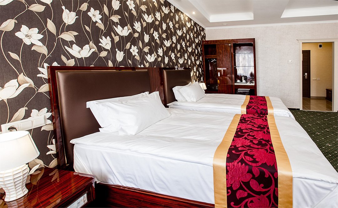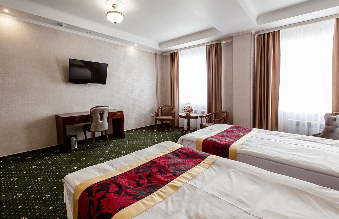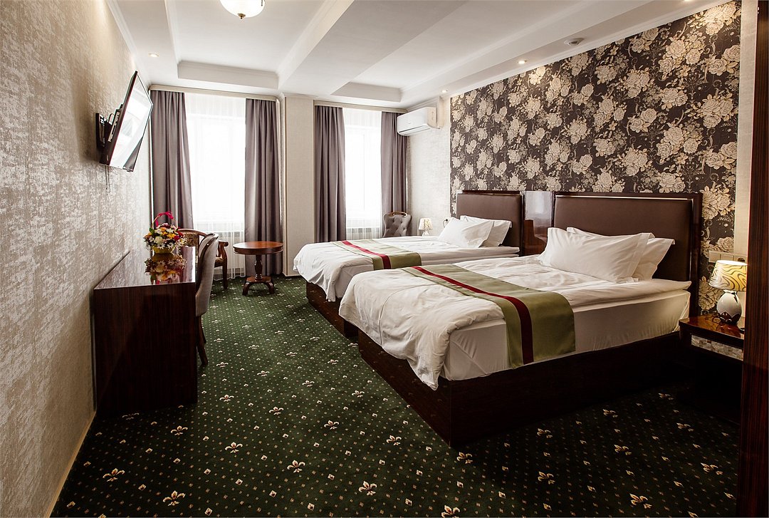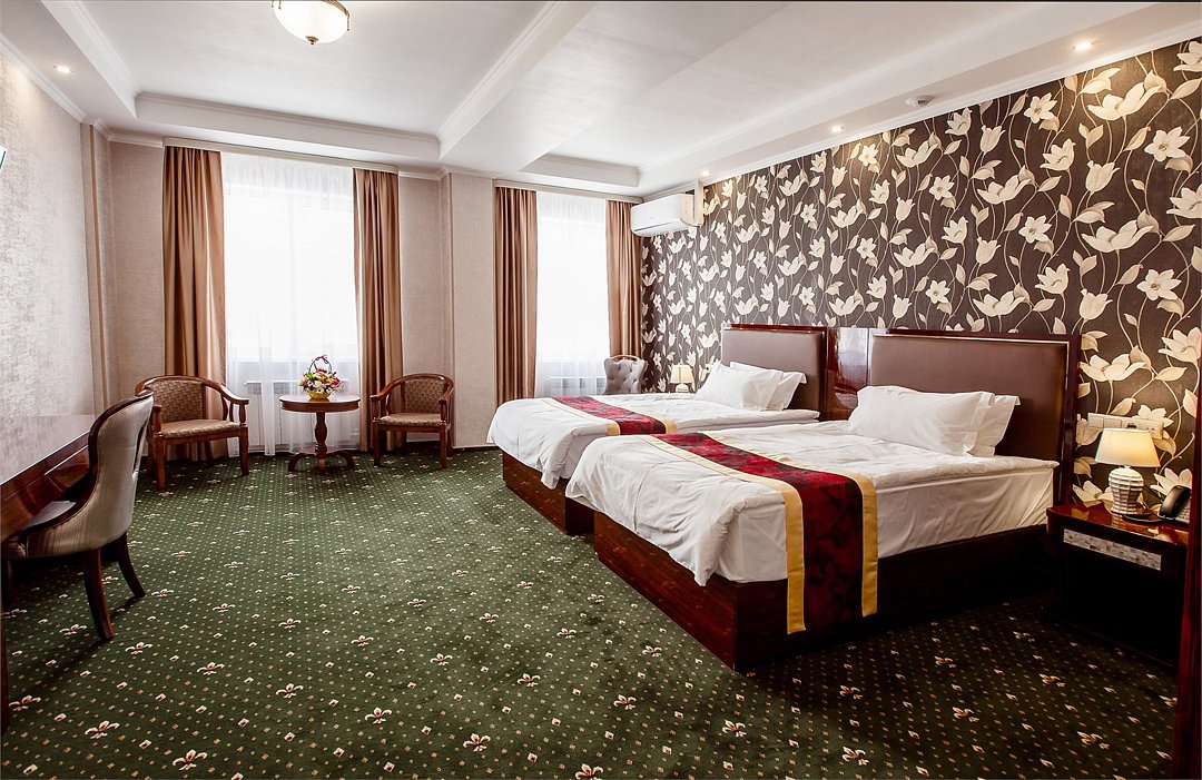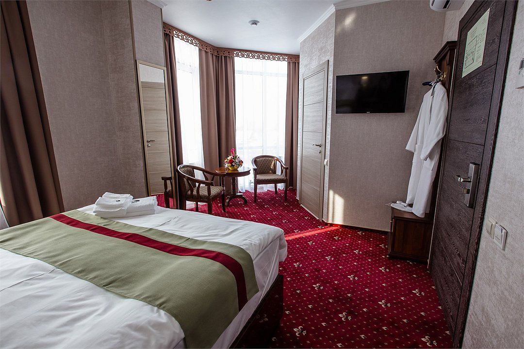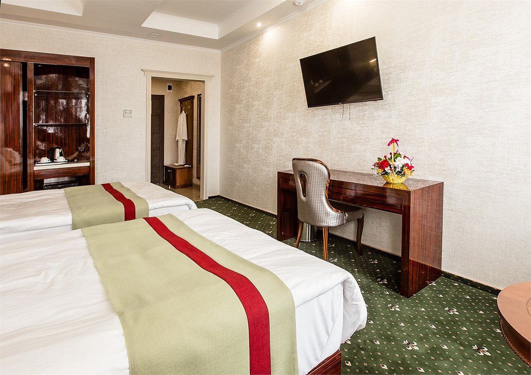 Описание номера «ПОЛУЛЮКС» с двумя односпальными кроватями • система «Умный дом»; • централизованная система управления климатом; • 2 кровати Small Double; • комфортные матрасы «Аскона»; • телевизор Smart TV с экраном диагональю 43 дюйма; • сейф с электронным замком, зарядные USB-порты у стола и прикроватных тумбочек, • ванная комната с тропическим душем, подогреваемым полом, встроенной в зеркало подсветкой для обеспечения максимального комфорта, фен; • восхитительно мягкие махровые полотенца и халаты, дарящие нежность от прикосновения после расслабляющего душа; • косметические средства RELAX REFRESH REVIVE; • мини-бар с холодильником; • рабочий стол; • журнальный столик с креслом; • 2 стула; • питьевая вода, электрический чайник, разные виды кофе и чая.Услуги и удобства